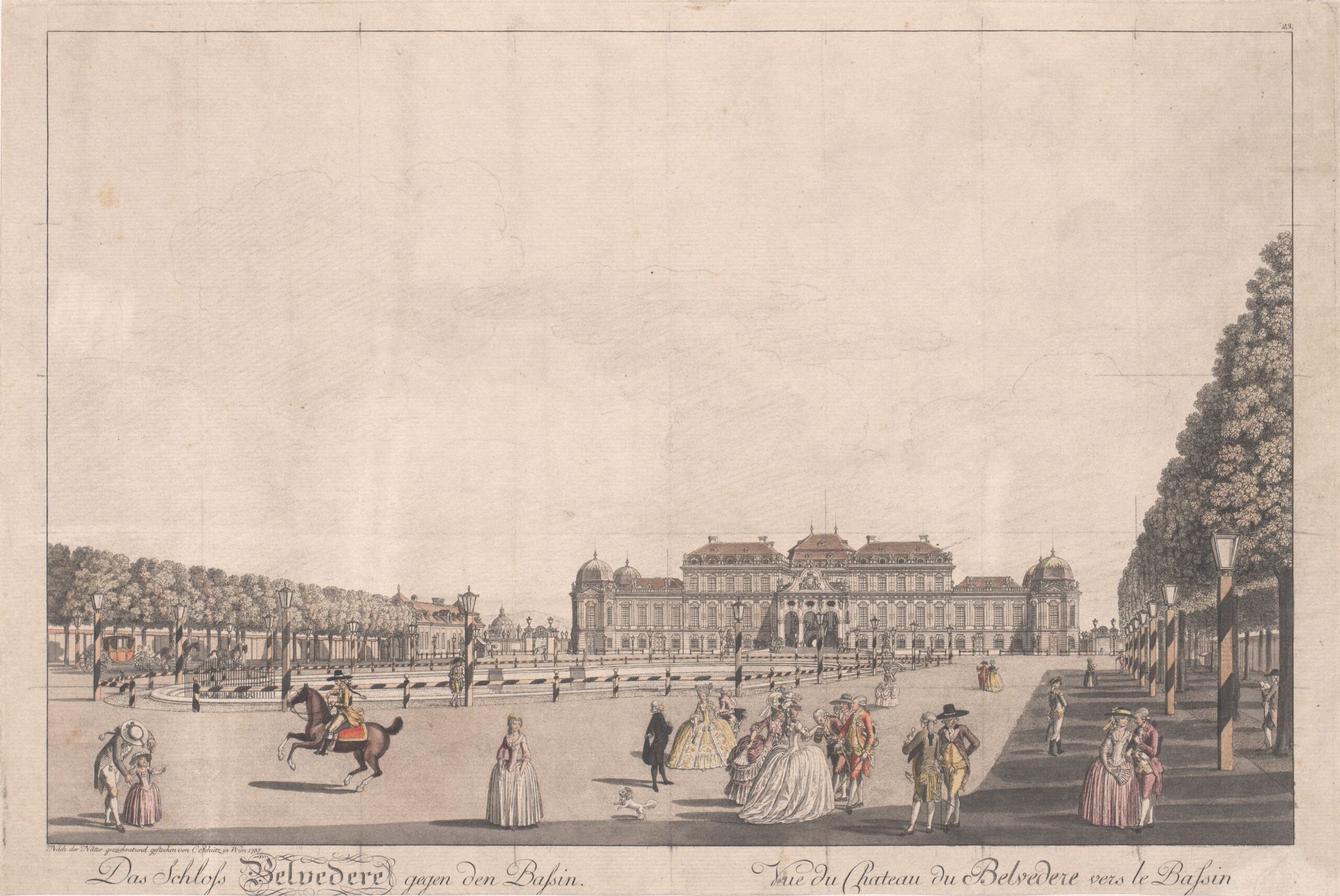 - „Das Schloss Belvedere gegen den Bassin.“, Blatt 23 aus einer Folge von Ansichten aus Wien und Niederösterreich („Sammlung von Aussichten der Residenzstadt Wien und ihren Vorstädten und einigen umliegenden Oertern“ etc.), herausgegeben von Artaria & Comp. (Schwarz Nr. 40) (vom Bearbeiter vergebener Titel)