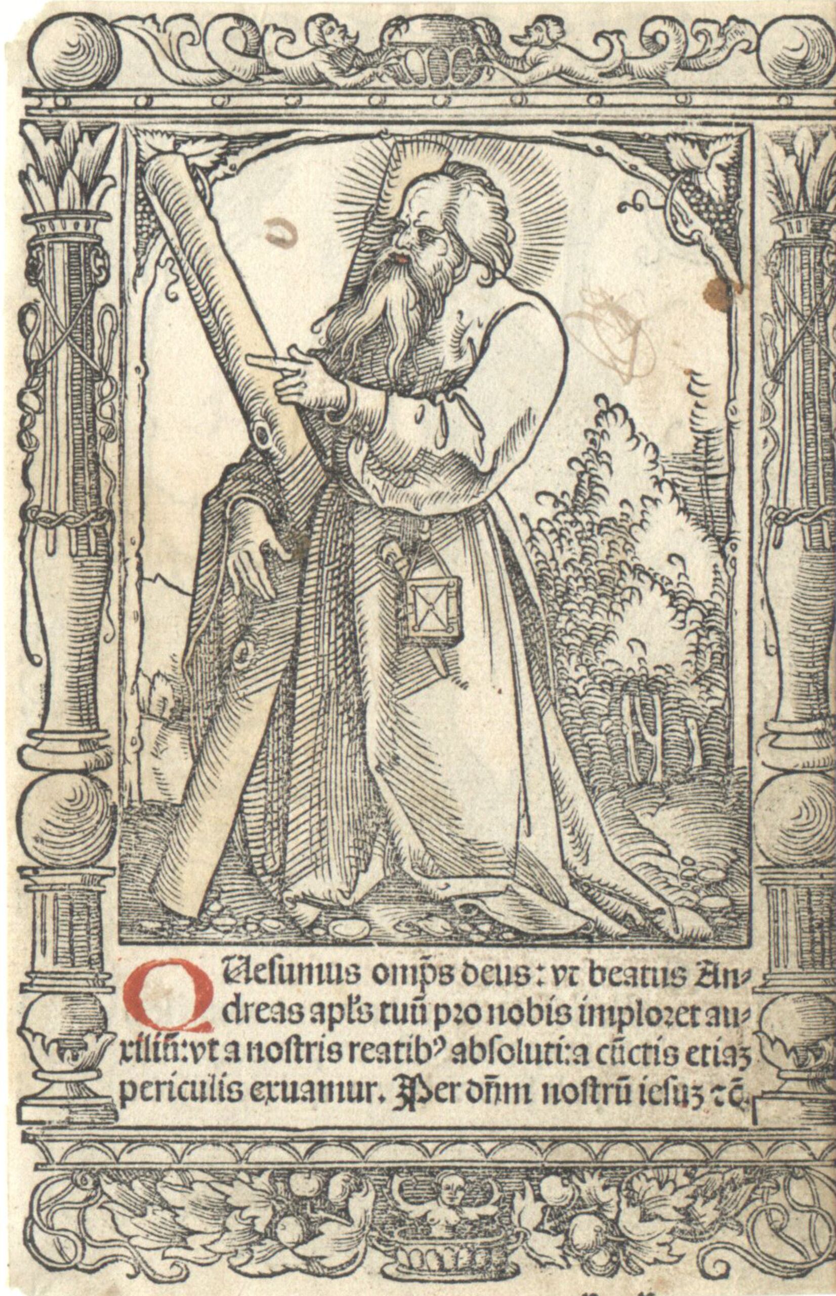 Buchillustration, Der Apostel Andreas in ornamentalem Rahmen, Blatt aus einem Gebetbuch, Hans Springinklee, MAK Inv.nr. KI 2943-23