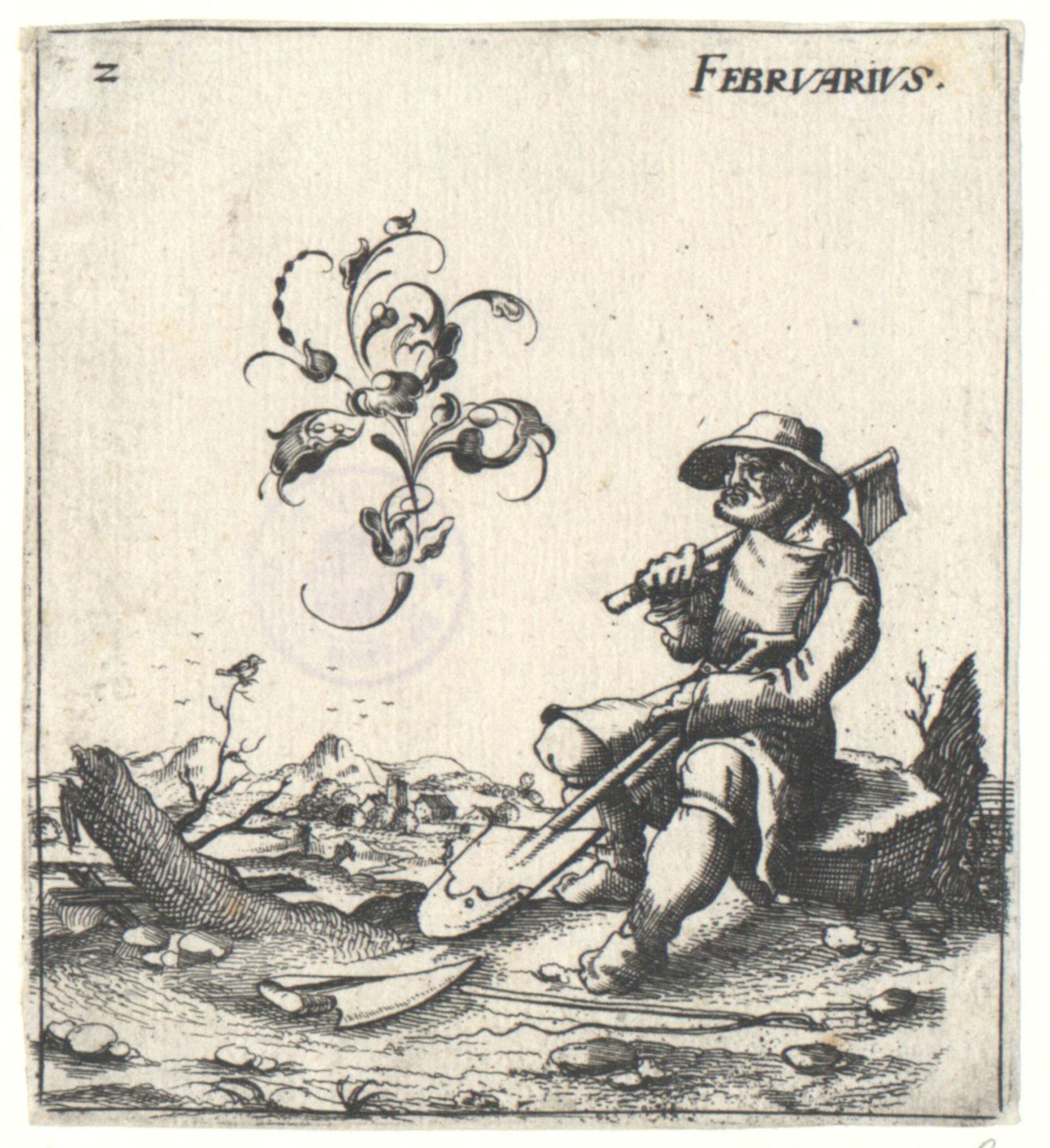 - Der Februar aus der Folge „XII Monatsbüchlein Vor die Goltschmidt, Mahler, und dergleichen liebhaber“, dargestellt jeweils von einem Bauern in einer dem Monat entsprechende Tätigkeit, Schwarzornament (vom Bearbeiter vergebener Titel)