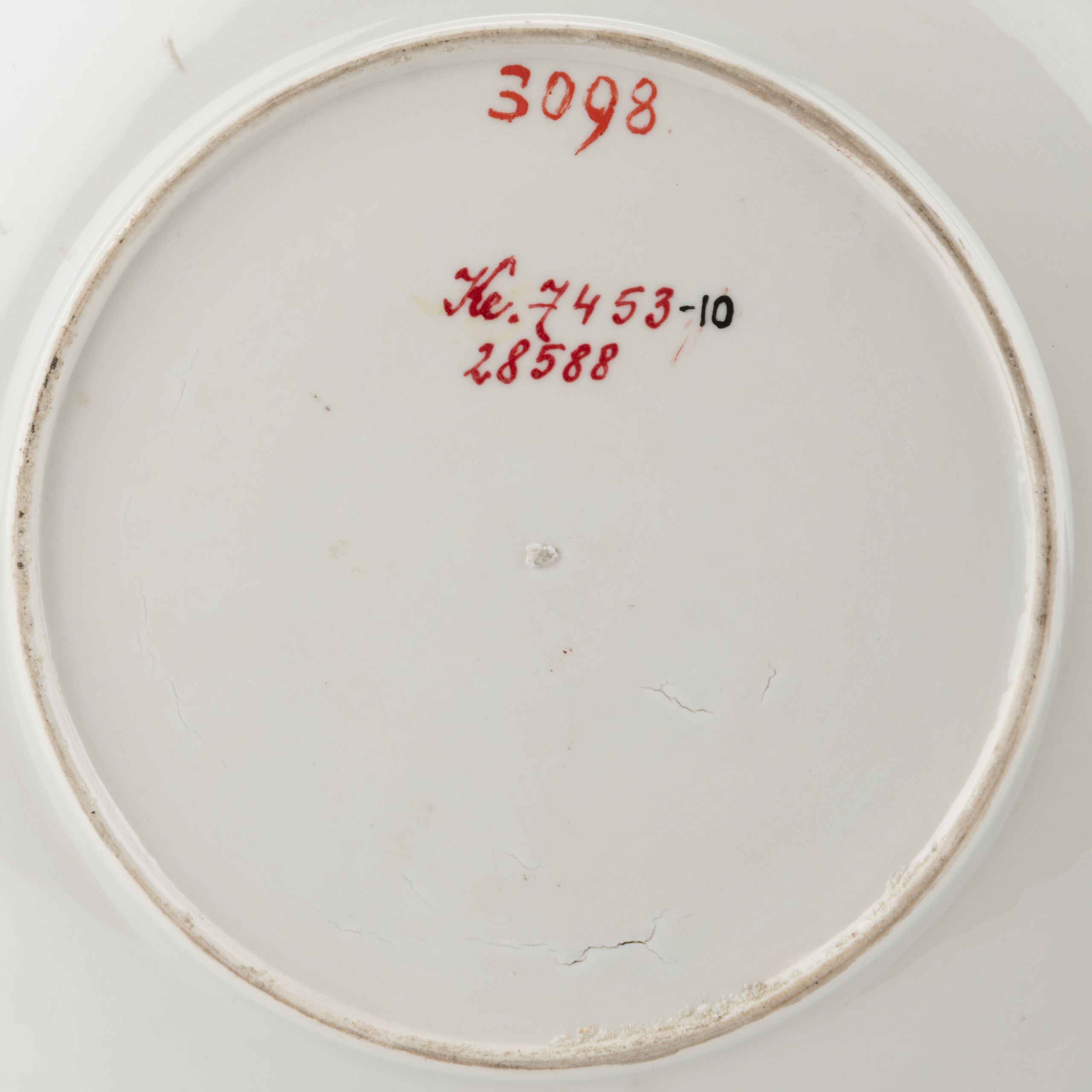Teller mit farbigem Dekor nach Majolika-Art, der nackte Hephaistos von hinten vor seinem Amboss und Schmiedefeuer stehend, im Hintergrund eine Flußlandschaft mit einer Ansiedlung am gegenüberliegenden Ufer