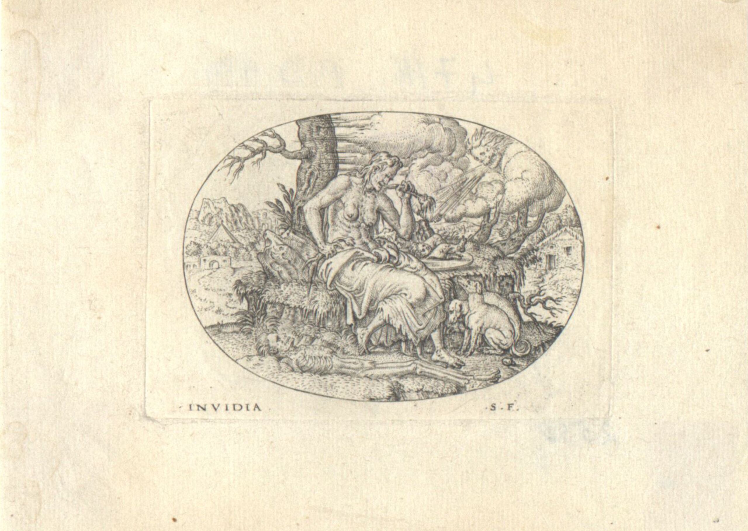 - Der Neid (Robert- Dumesnil Nr. 184) aus einer Folge allegorischer Frauengestalten in Landschaft in Querovalen (vom Bearbeiter vergebener Titel)