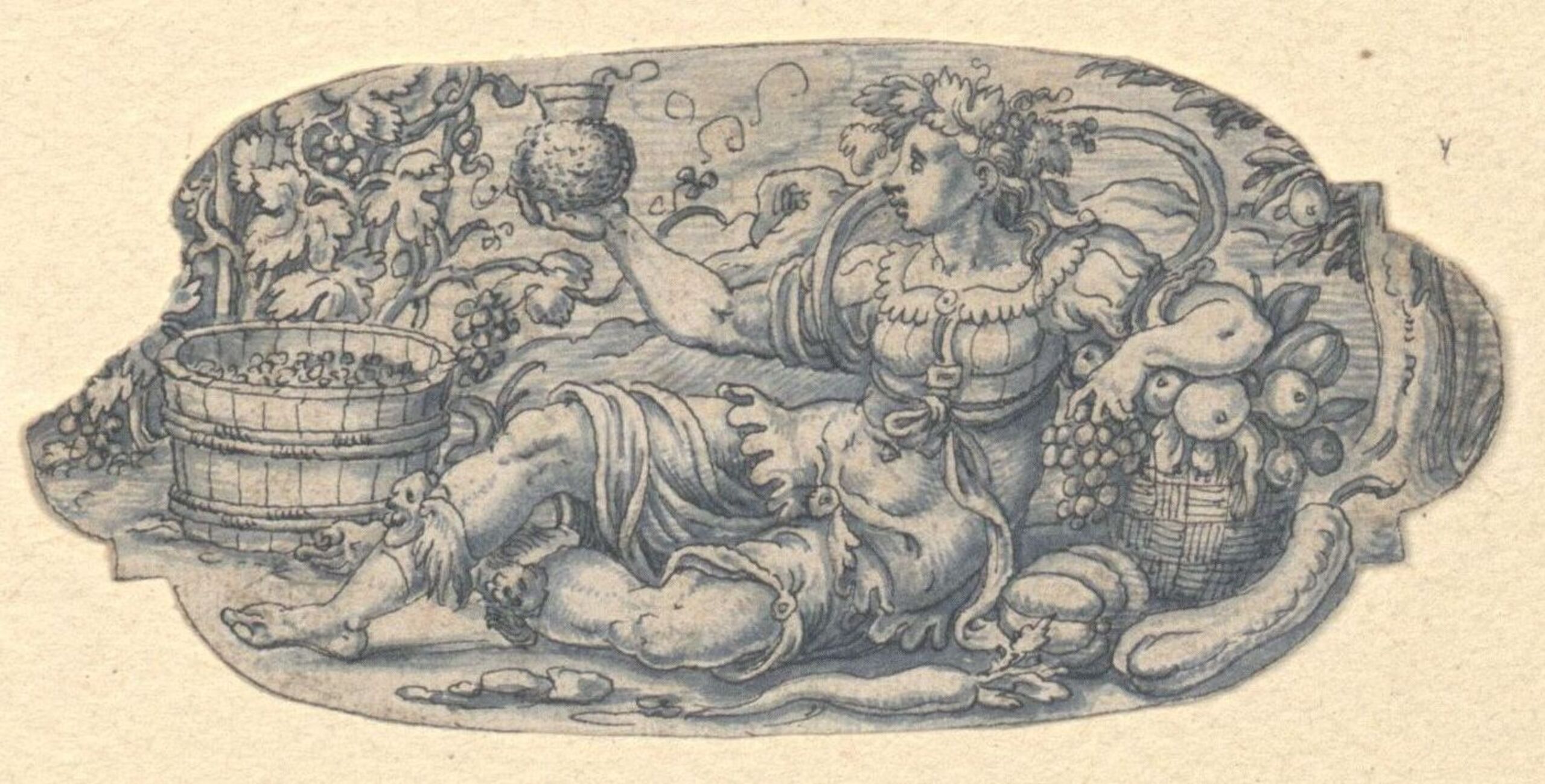 Entwurf für Monatsbild mit weiblicher Symbolfigur für den Oktober. Blatt in Kartuschenform.