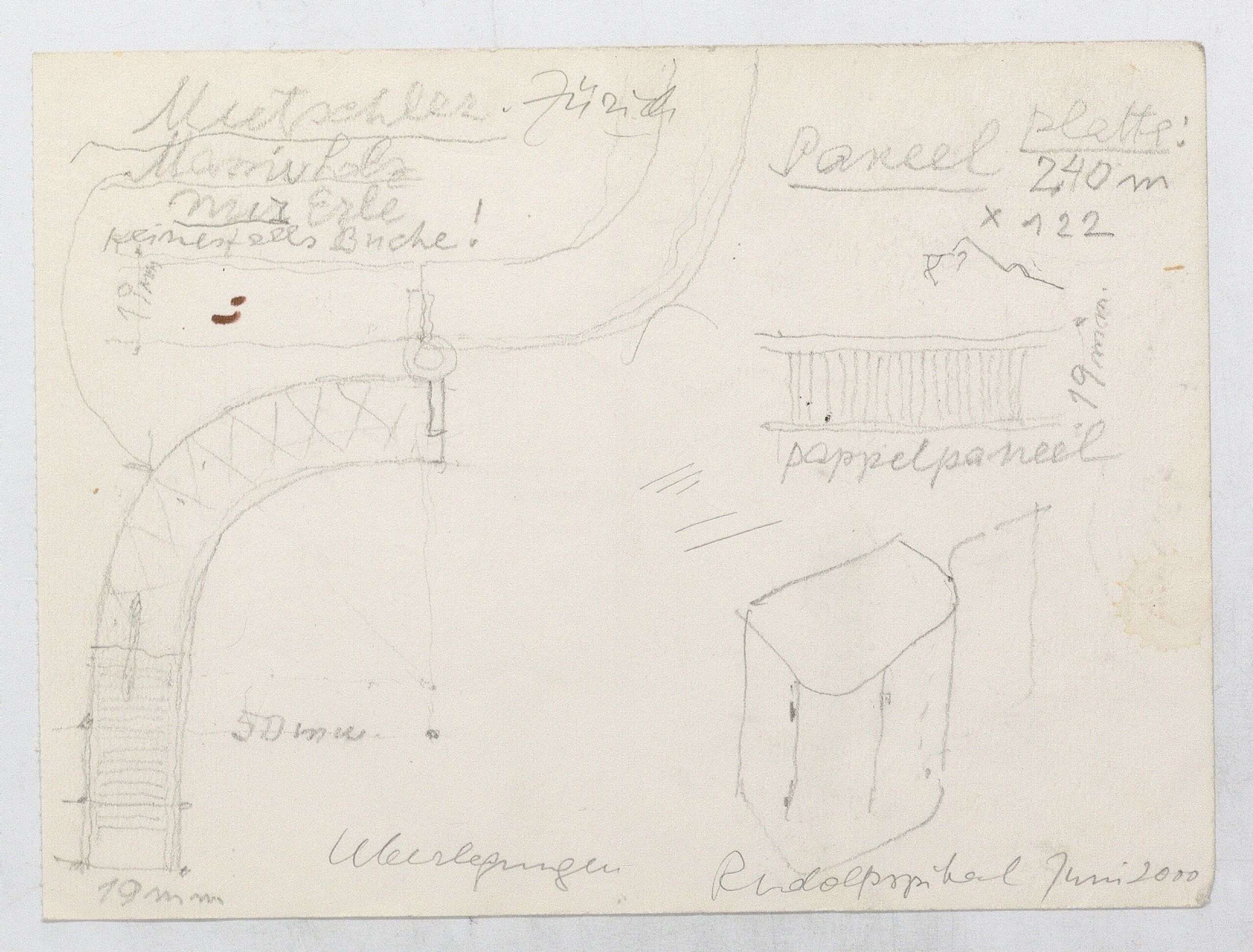 - Details des Scharniers und des Paneels der Schranktüren, Skizze des Fernsehschrankes (vom Bearbeiter vergebener Titel)