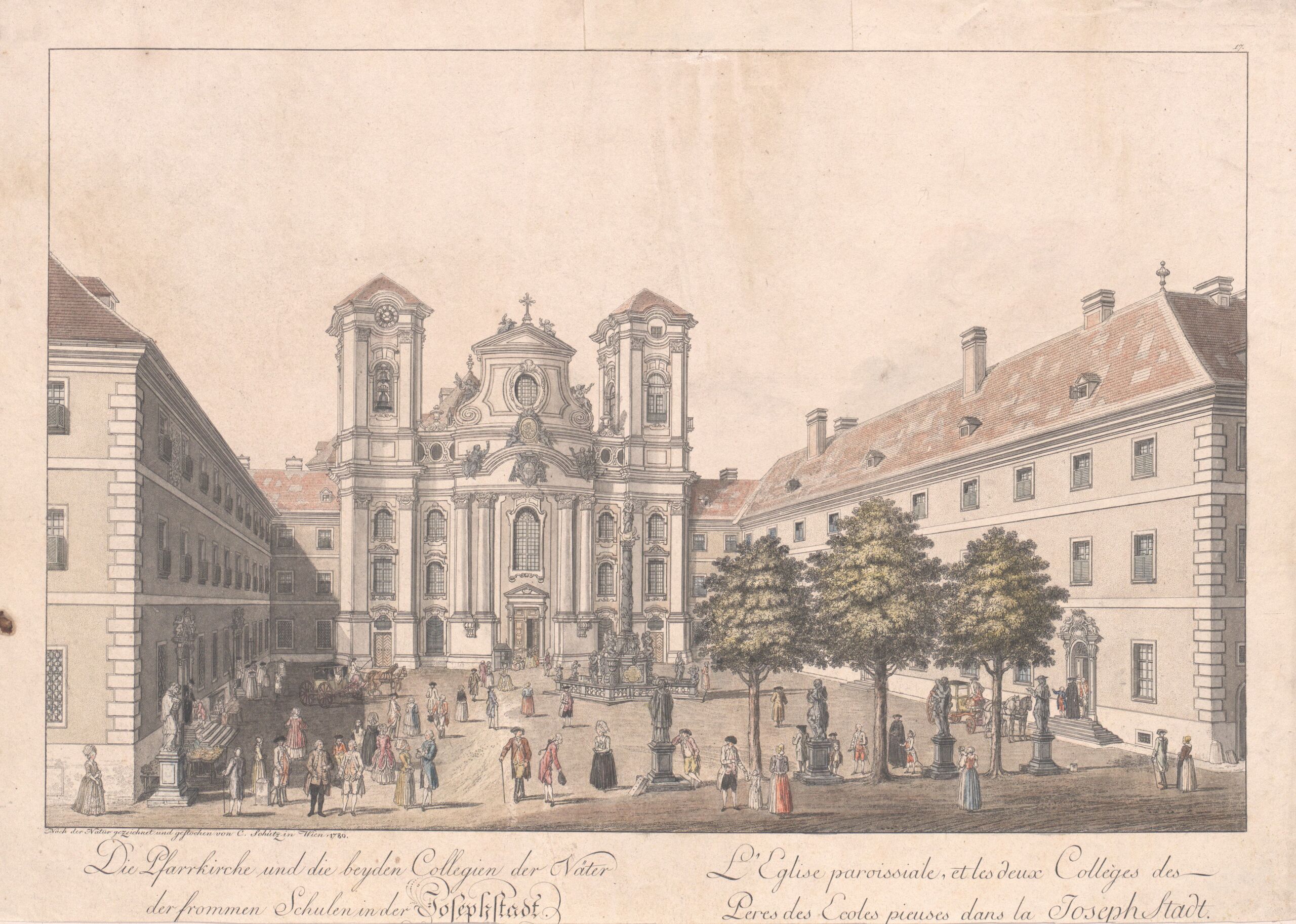 - Text am Objekt: Die Pfarrkirche und die beyden Collegien der Väter/ der frommen Schulen in der Josephstadt. / L‘ Eglise paroissiale, et les deux Collèges des/ Peres des Ecoles pieuses dans la Joseph Stadt / Nach der Natur gezeichnet und gestochen von C. Schütz in Wien 1780 / 17