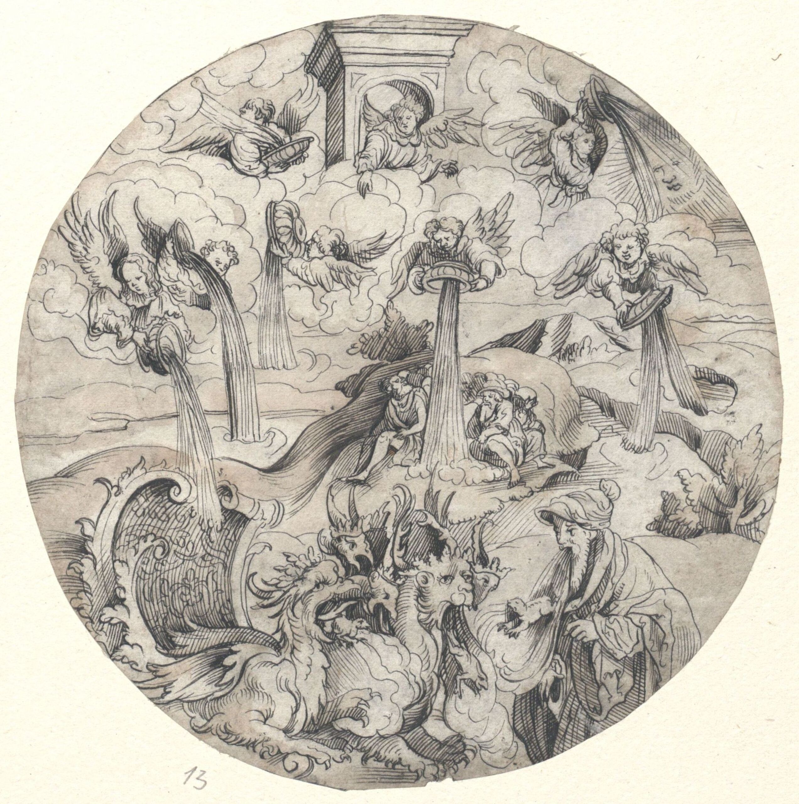Entwurf für einen Scheibenriß mit Darstellung der Ausgießung des Zornes Gottes auf die Erde durch die sieben Engel, die ihn aus Schalen ausgießen. Im Vordergrund Drachen und Prophet, Kröten speiend (Apokalypse 15, 16).
