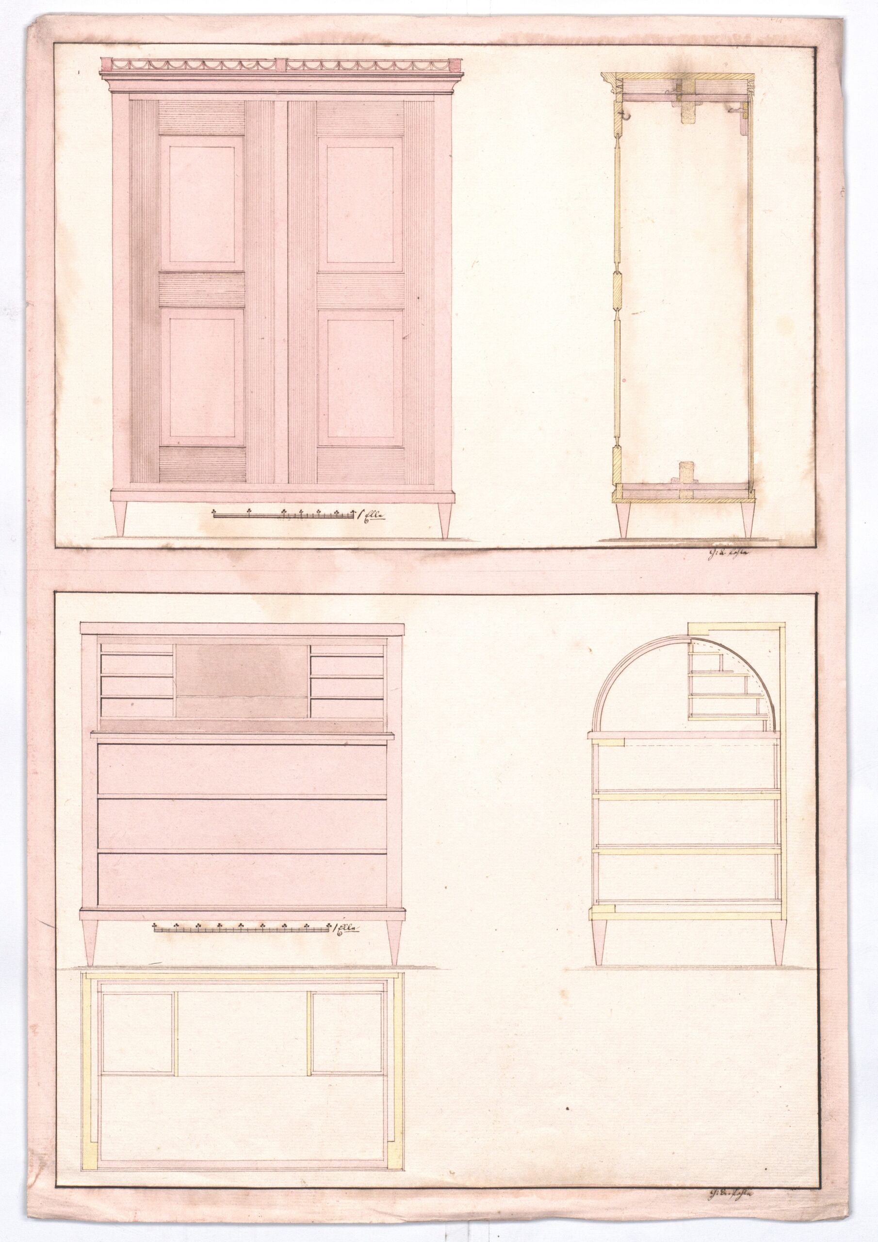 Möbelentwurf, Diverse Projektionen eines Schrankes und eines Sekretärs, Gottlieb August Pohle, MAK Inv.nr. KI 7813-16