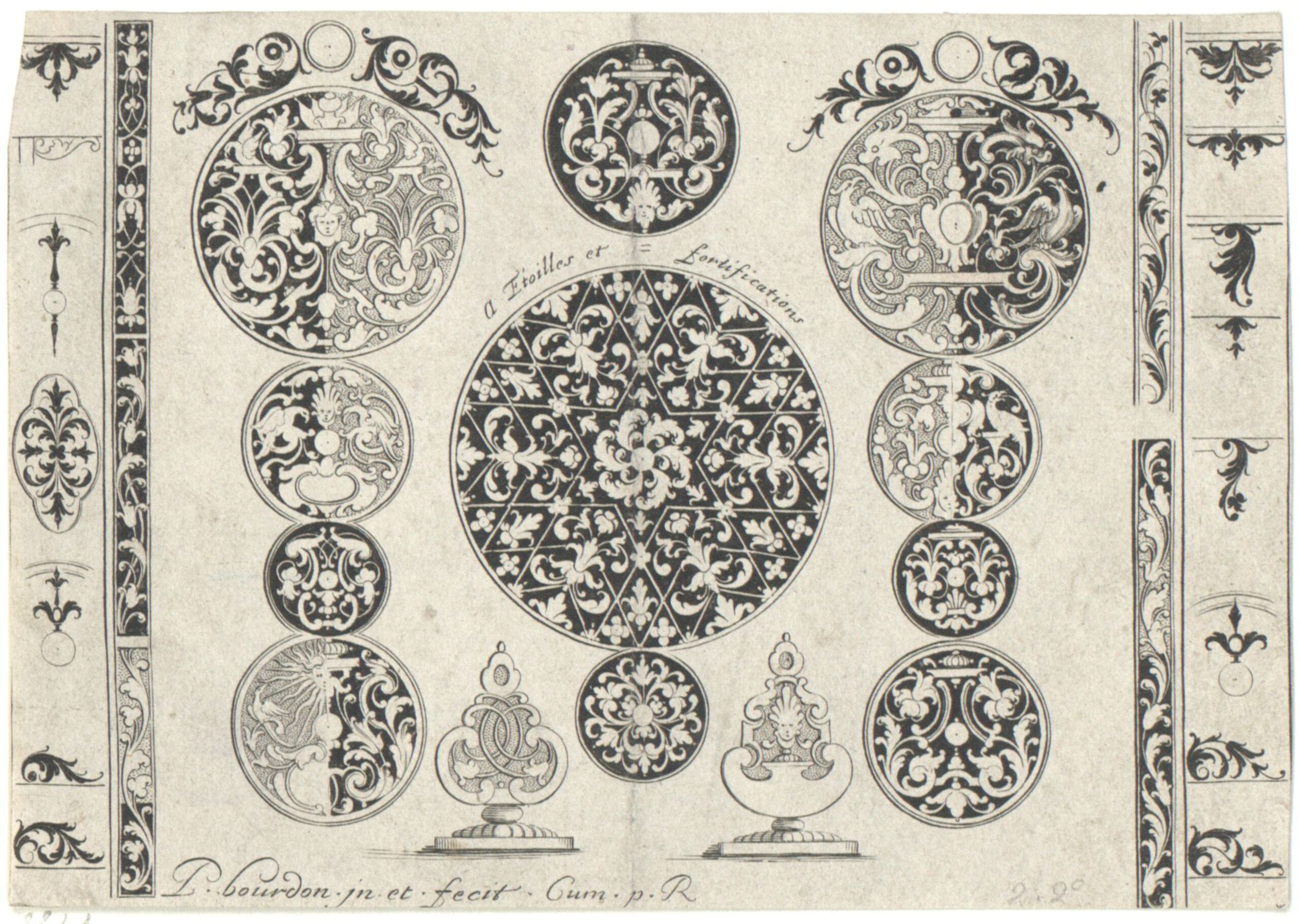 Ornamentstich, Dosendeckel, Blatt aus der Folge „Livre Second Essais de Gravure Par Pierre Bourdon etc.“, herausgegeben von P. Bourdon, Pierre Bourdon, MAK Inv.nr. KI 2241-6