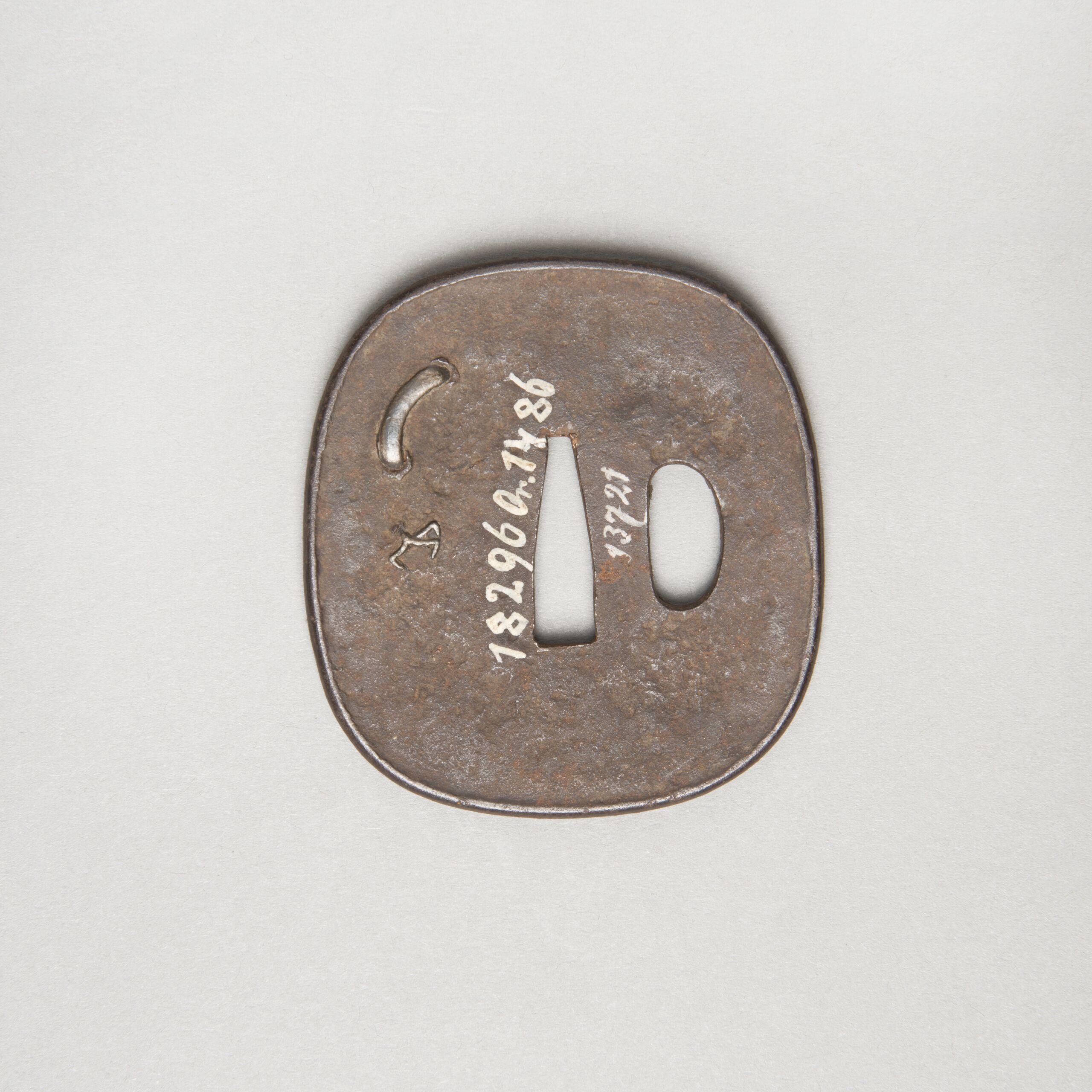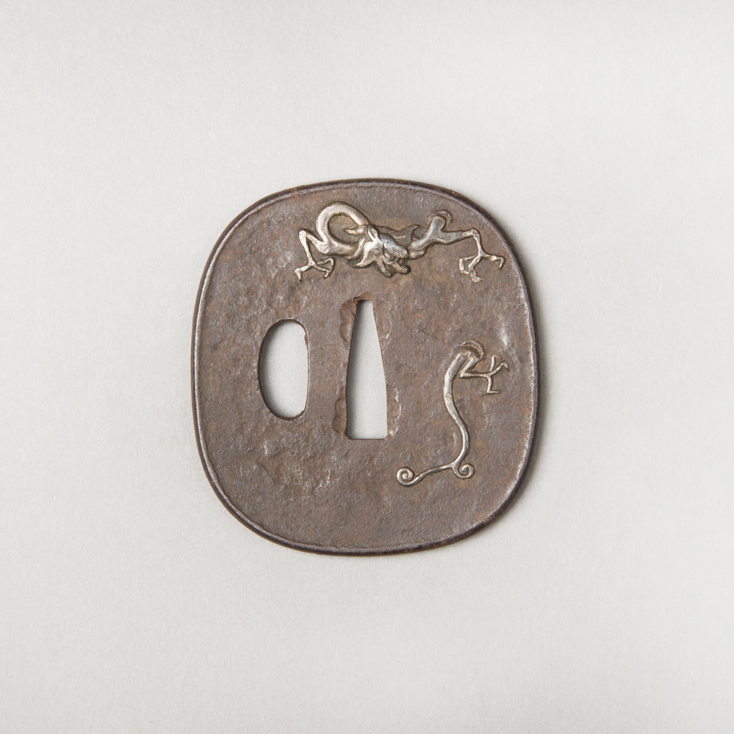Form: Rechteck mit abgerundeten Kanten (nadekakugata 撫角形); erhöhter Rand; Relief mit Silbereinlagen (zōgan 象嵌 = Tauschierung); links neben der länglichen Öffnung in der Mitte (nakagoana 中心穴 oder茎穴) die Öffnung kozukahitsu 小柄櫃.
