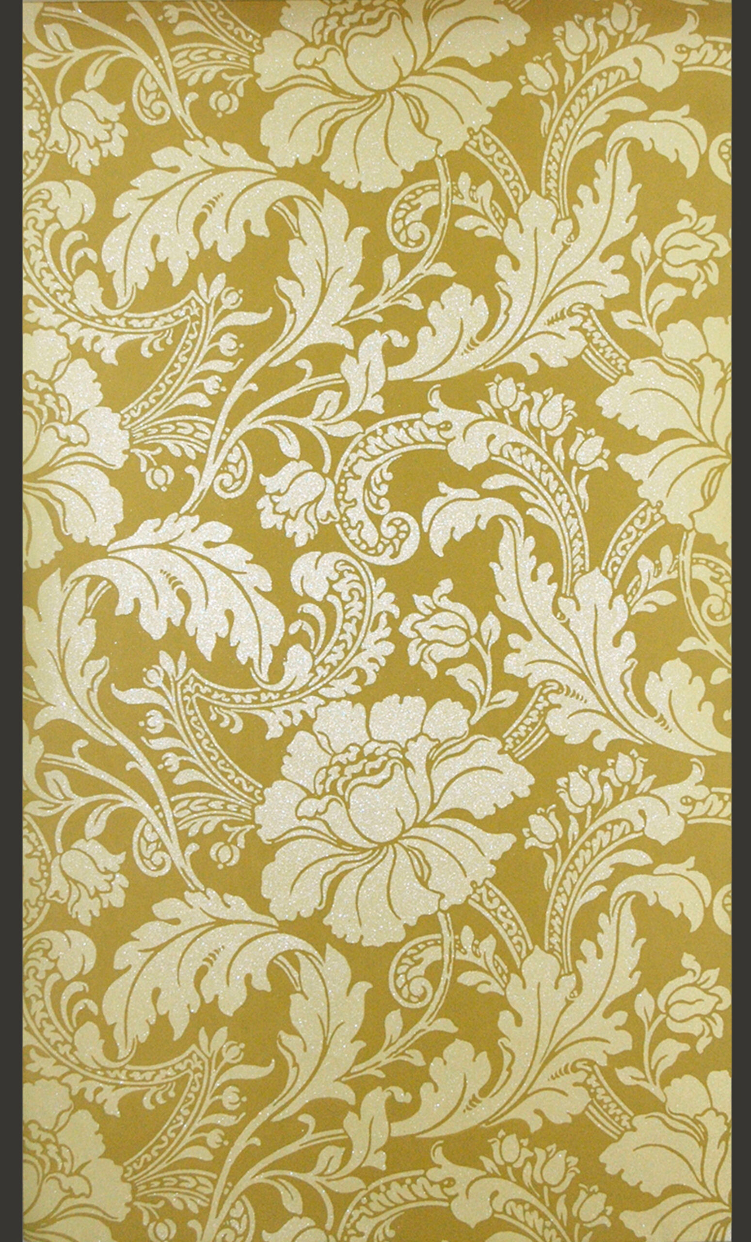 - Helle Ranken mit großen Blüten und gerollten Blättern, auf gelbem Grund (deskriptiver Titel)