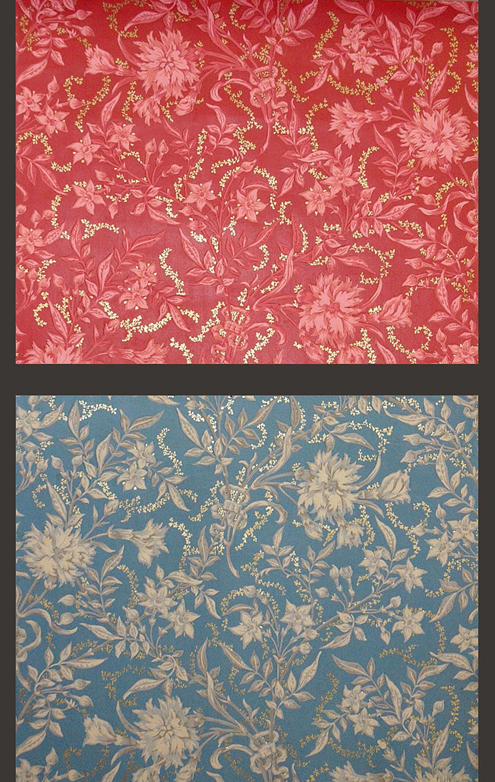 - Zarte Blumenranken (Rot- bzw. Beigetöne), Maschen und kleine goldene Blüten, auf rotem bzw. blauem Grund (deskriptiver Titel)