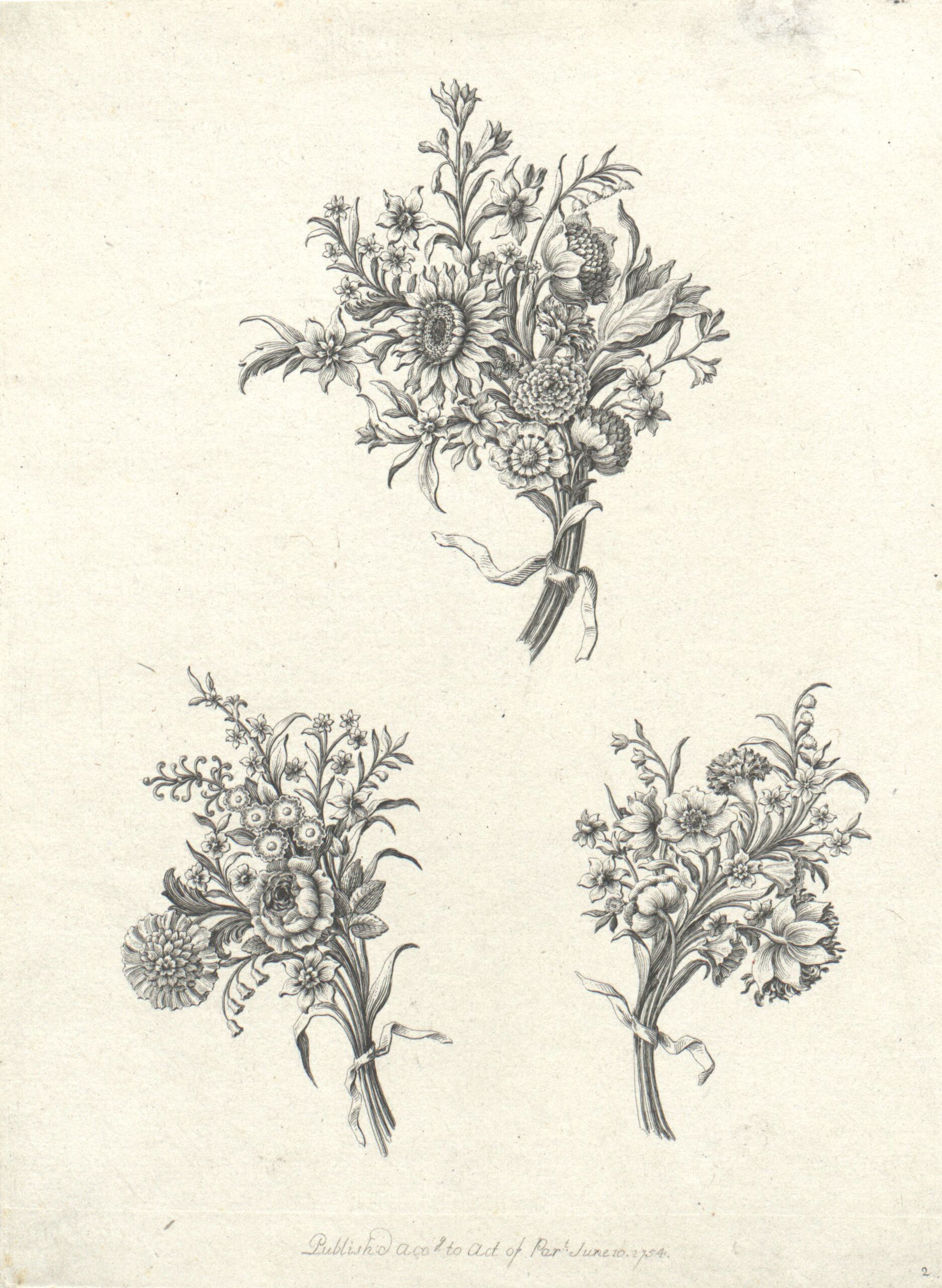 Ornamentstich, Drei Blumensträuße, Blatt 2 aus einer Folge von Blumen, herausgegeben von Hemmerich, Cornelius Heinrich Hemmerich, MAK Inv.nr. KI 1-452-3