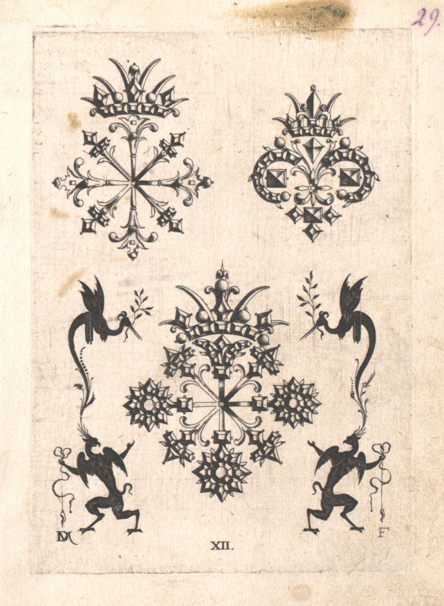 - Drei Broschen, umgeben von silhouettierten grotesken Figuren, Blatt 12 (XII) aus einer Folge von Goldschmiedearbeiten, auf dem Titelblatt die Aufschrift „In timore dei Daniel Mignot Invent. sculp. et excudd. hoc Augustae Vindelicorum 1596“, herausgegeben von D. Mignot (vom Bearbeiter vergebener Titel)