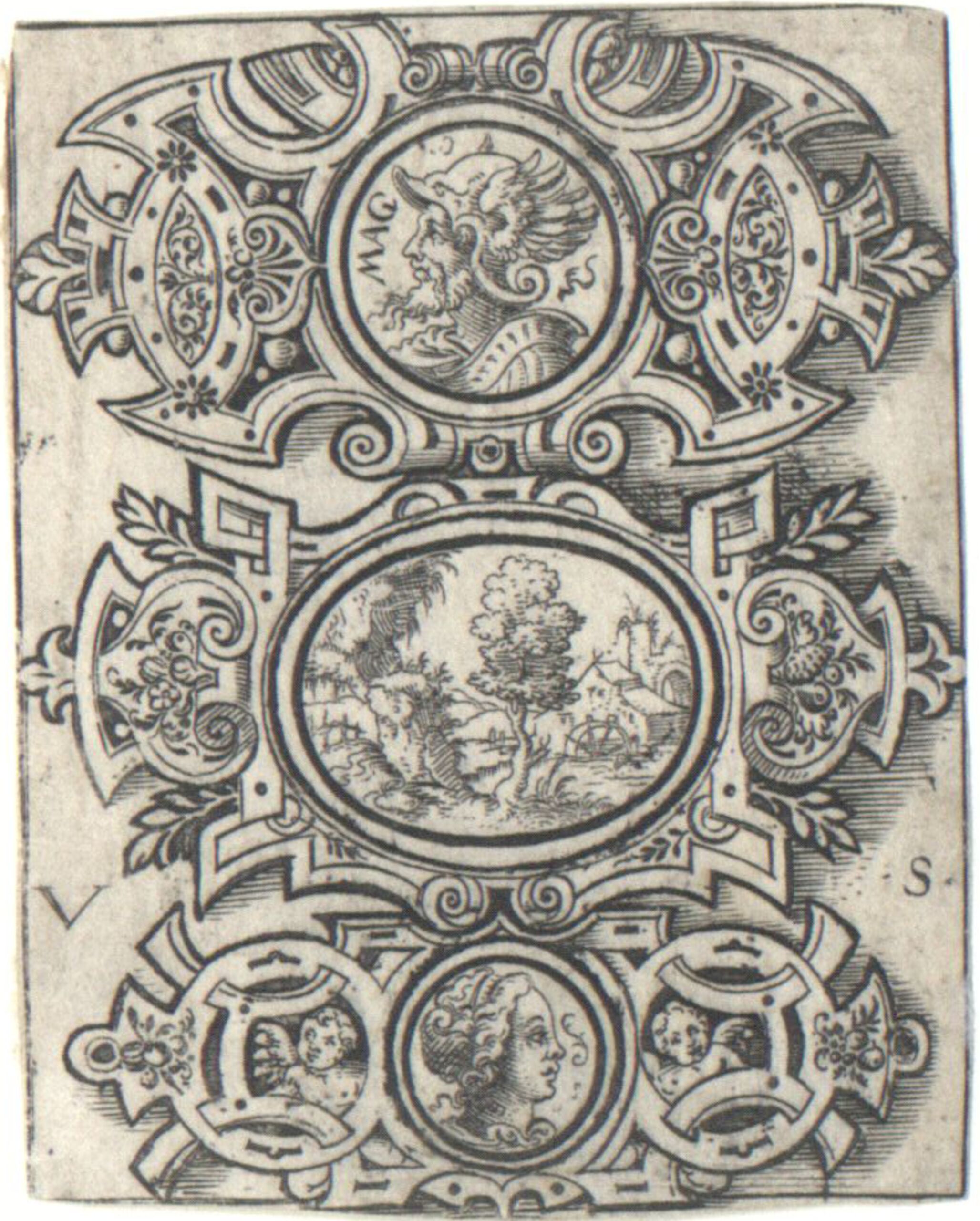 Ornamentstich, Drei Medaillons, Blatt aus einer Folge von Goldschmiedearbeiten in Form von Kartuschen, Virgil Solis, MAK Inv.nr. KI 6469