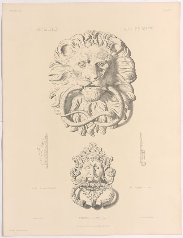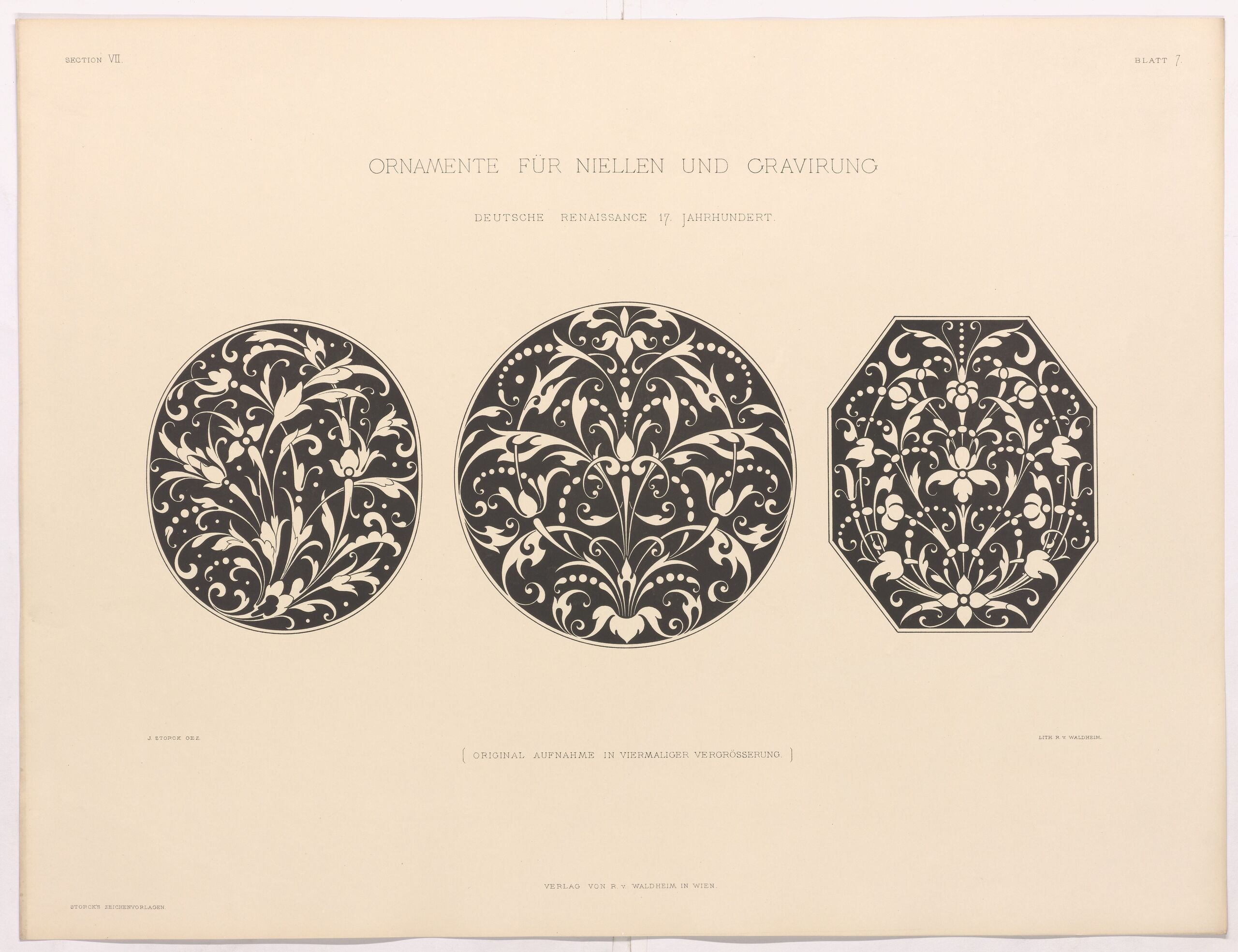 - Text am Objekt: SECTION VII; BLATT 7; ORNAMENTE FÜR NIELLEN UND GRAVIERUNG / DEUTSCHE RENAISSANCE 17. JAHRH.; (ORIGINAL AUFNAHME IN VIERMALIGER VERGRÖSSERUNG.); J. STORCK GEZ.; LITH. R. V. WALDHEIM; ORIGINAL-COMPOSITION VON PROF. STORCK.; VERLAG VON R. V. WALDHEIM; STORCK'S ZEICHENVORLAGEN.
