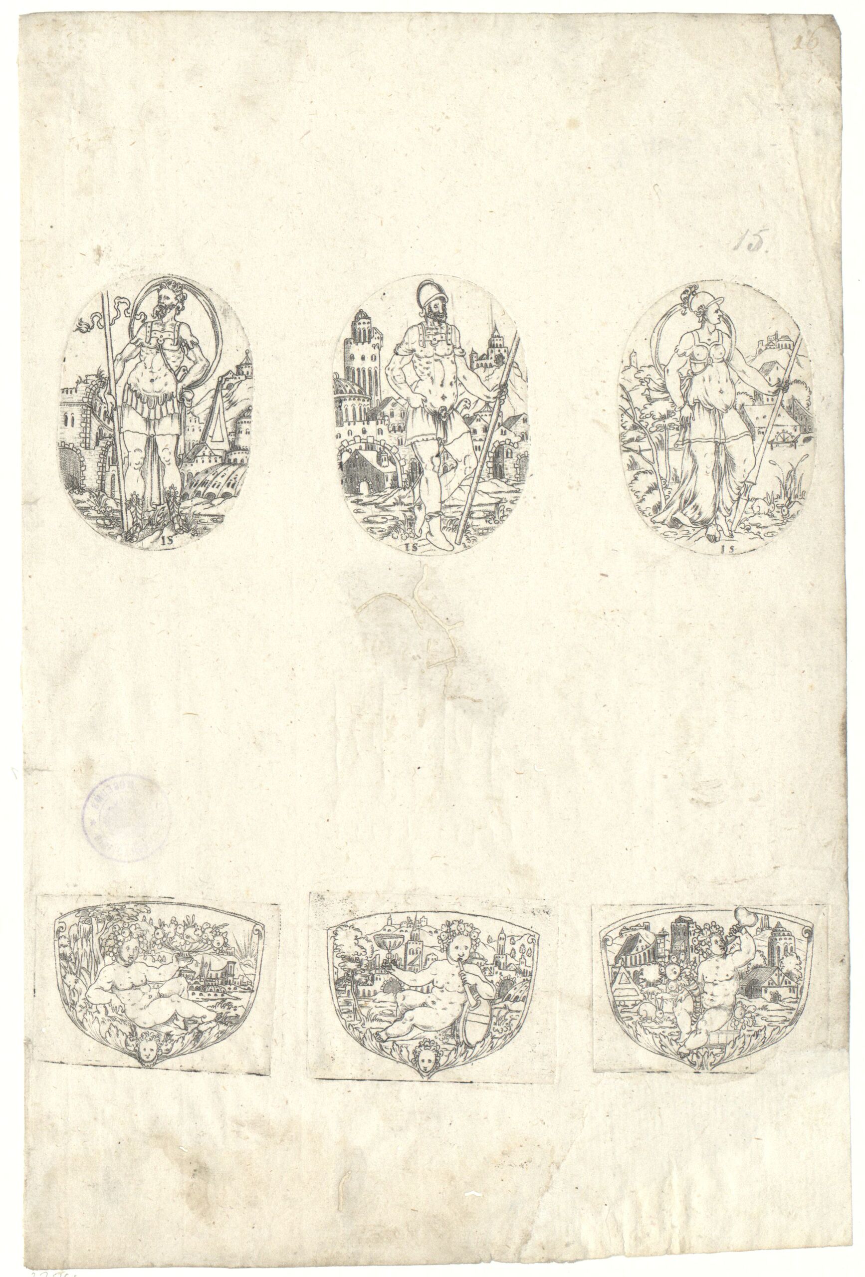 Druckgrafik, Drei ovale Medaillons mit antiken Männer- und Frauengestalten und drei Plaketten mit Bacchus, Jonas Silber, MAK Inv.nr. KI 2224-15