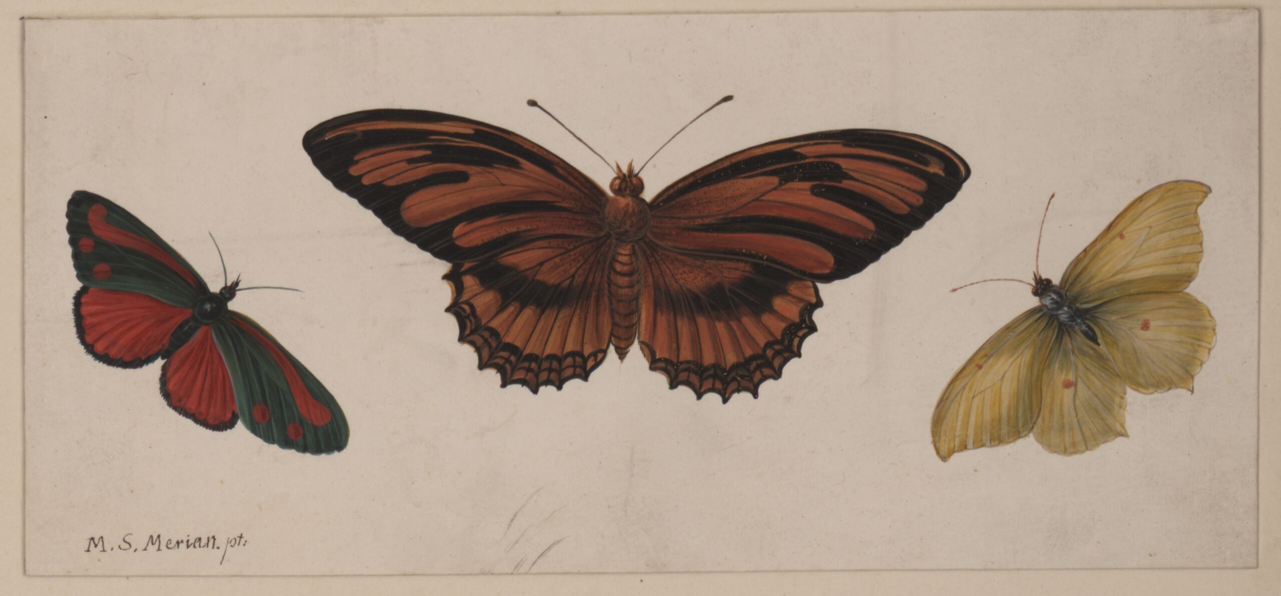 drei Schmetterlinge naturgetreu dargestellt, Signatur M.S. Merian