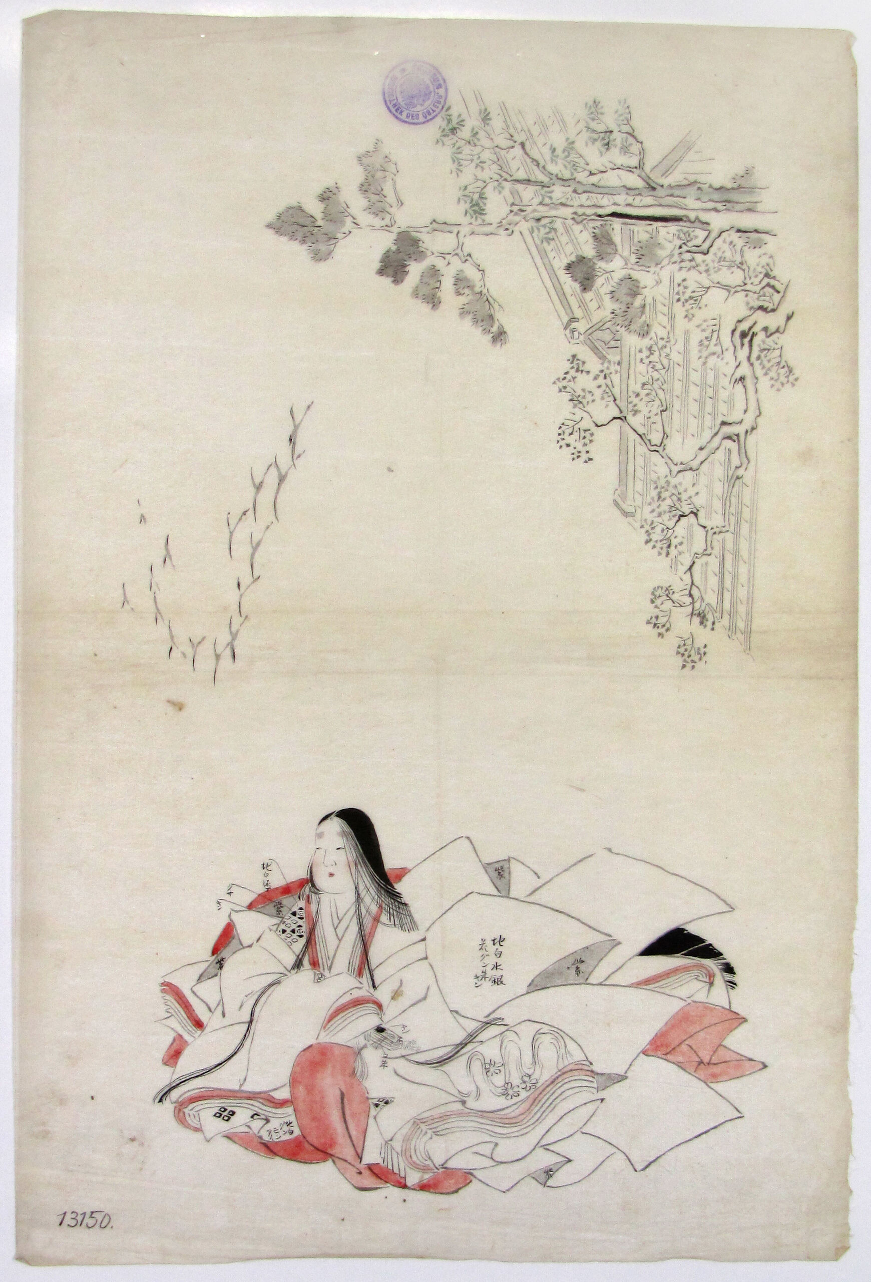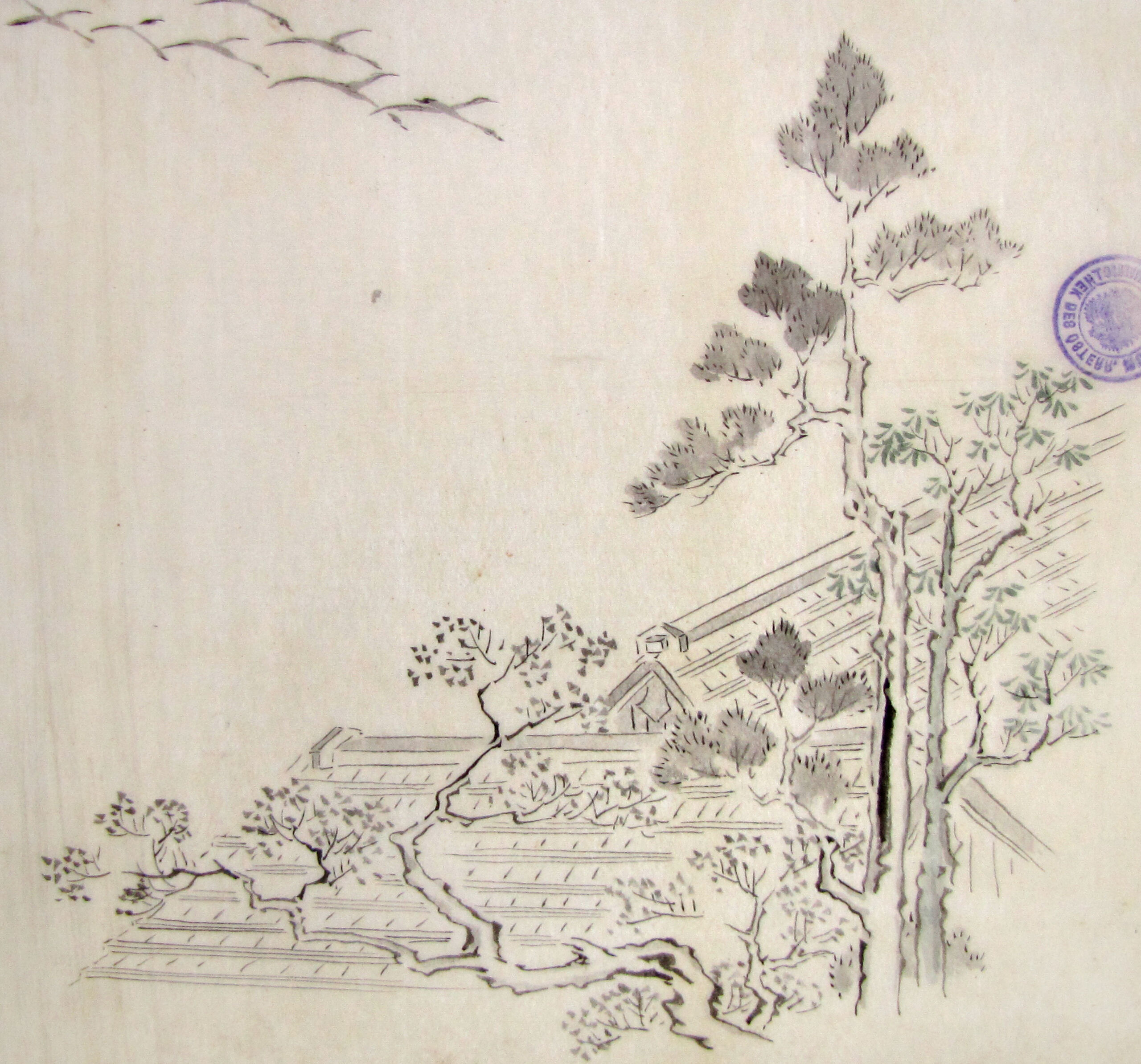 Tuschezeichnung, Drei Skizzen: Hofdame im Stile der Heian-Zeit, fliegende Kraniche, Dachlandschaft, Anonym, MAK Inv.nr. HM 13150