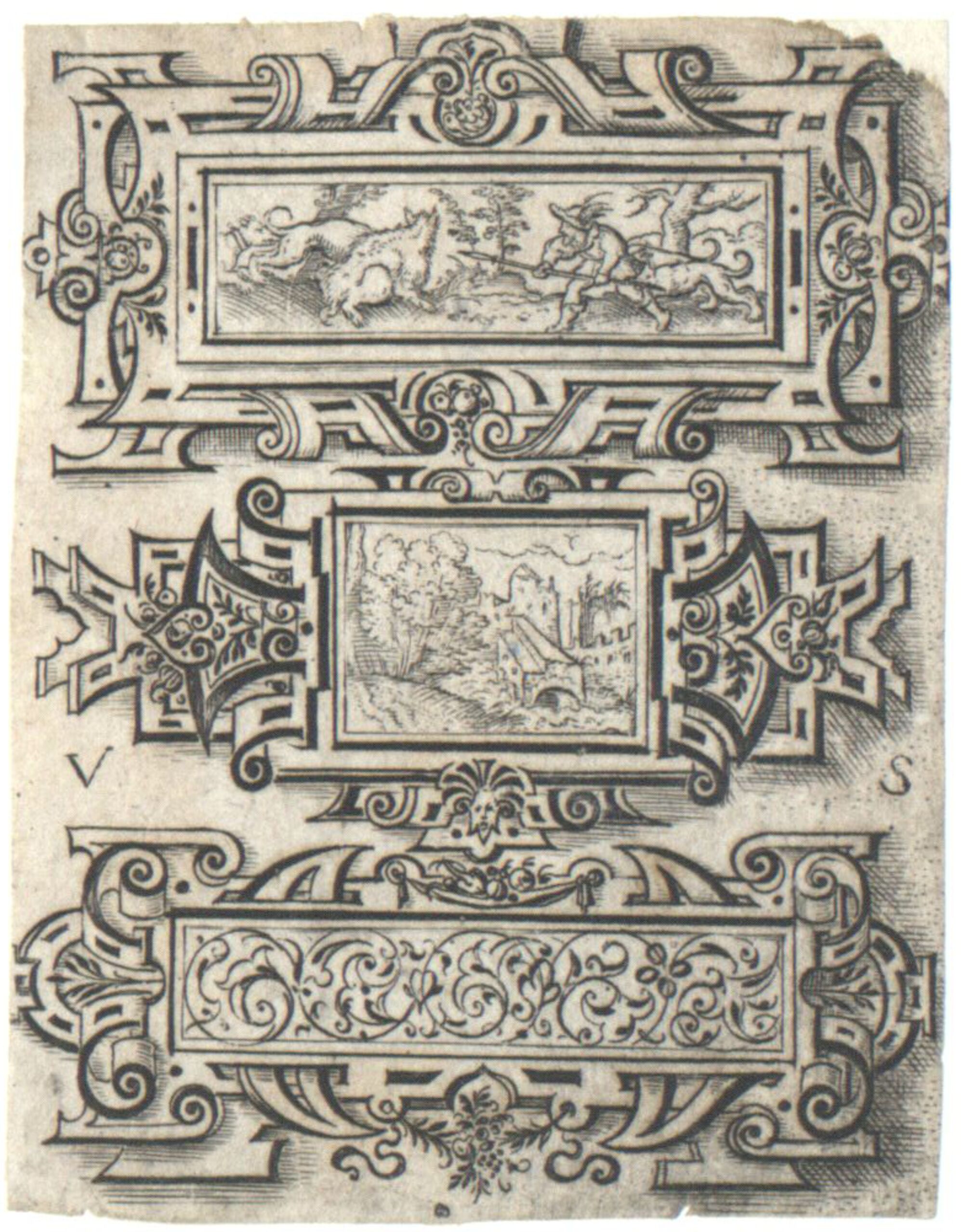 Ornamentstich, Drei Zierplättchen in Form von Kartuschen mit einer Jagd, einer Landschaft und Arabesken, Virgil Solis, MAK Inv.nr. KI 2856