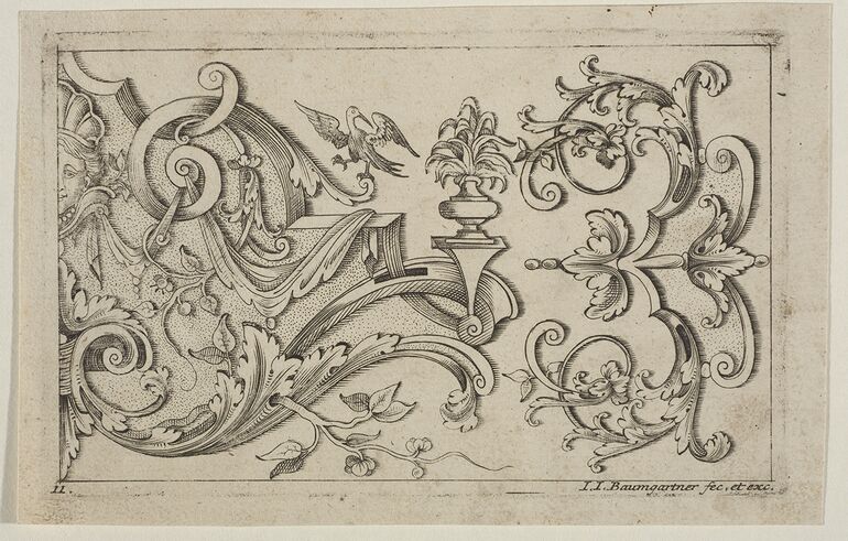 • Ornamentstich, Ein Blatt aus der Folge „Gantz Neu Invendirtes Laub und Bändl-Werck.“ Gestochen und verlegt von J. J. Baumgartner, Johann Jakob Baumgartner, MAK Inv.nr. KI 2682-5