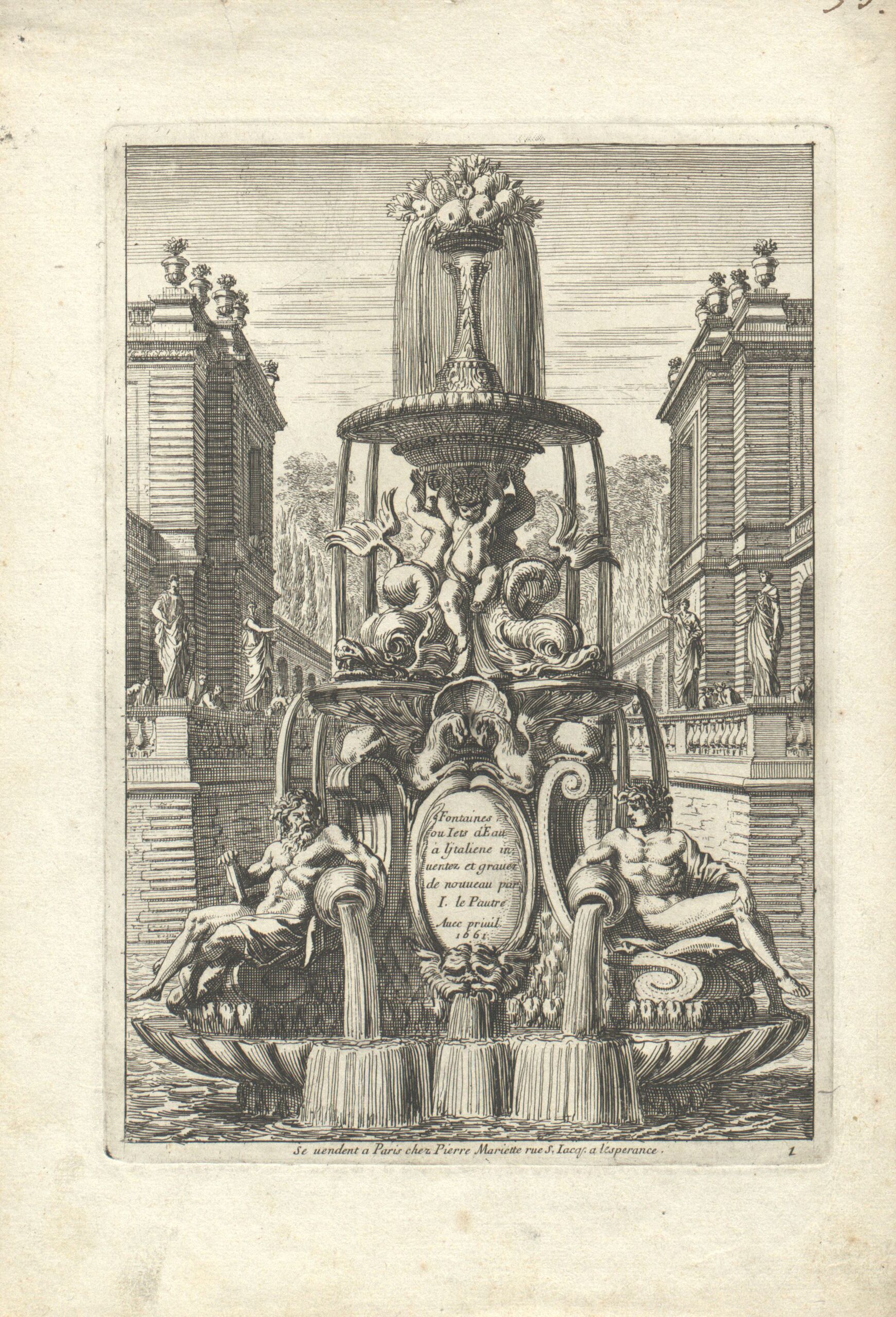 - Text am Objekt: Fontaines/ ou Jets d‘ Eau/ à l‘ jtalienne in/ ventez et gravez/ de nouveau par/ I. le Pautre/ Avec privil/ 1661 / Se vendent a Paris chez Pierre Mariette rue S.t Iacq. a l‘ esperance / 1