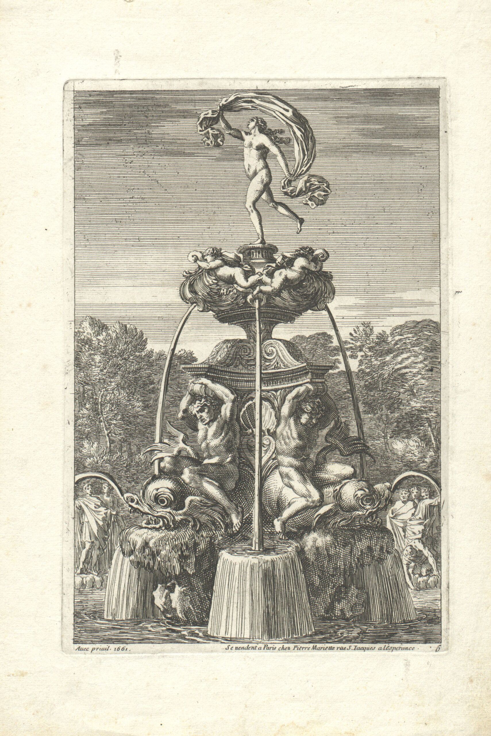 - Ein Brunnen, Blatt 6 mit Titel aus der Folge „Fontaines ou Jets d‘ Eau à l‘ jtalienne“, herausgegeben von P. Mariette (vom Bearbeiter vergebener Titel)