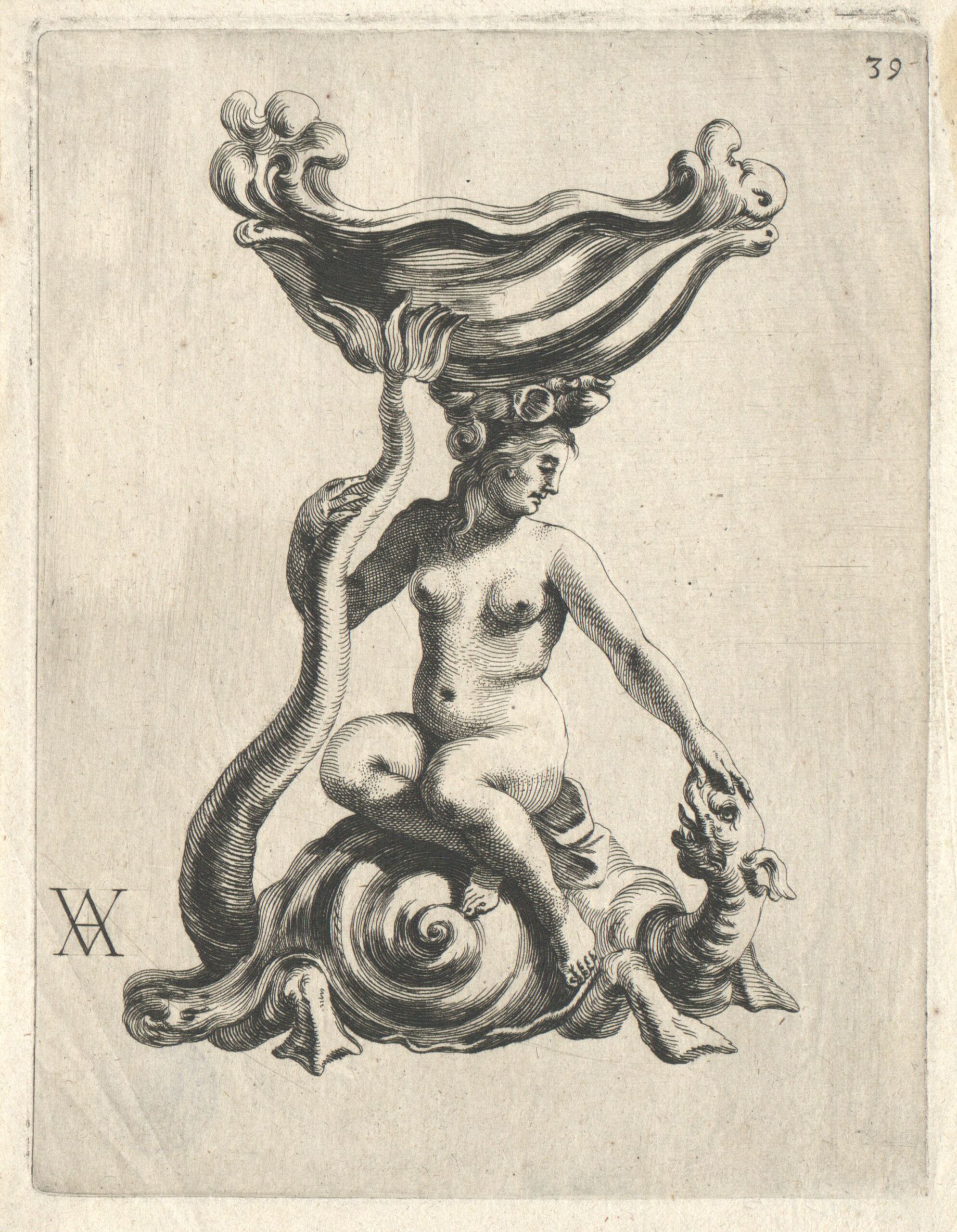 - Ein Gefäß, Blatt 39 aus der Folge „Modelli Artificiosi ... Modelles Artificiels ... Constighe Modellen Van verscheyden silvere Vasen etc.“, herausgegeben von C. van Vianen (vom Bearbeiter vergebener Titel)