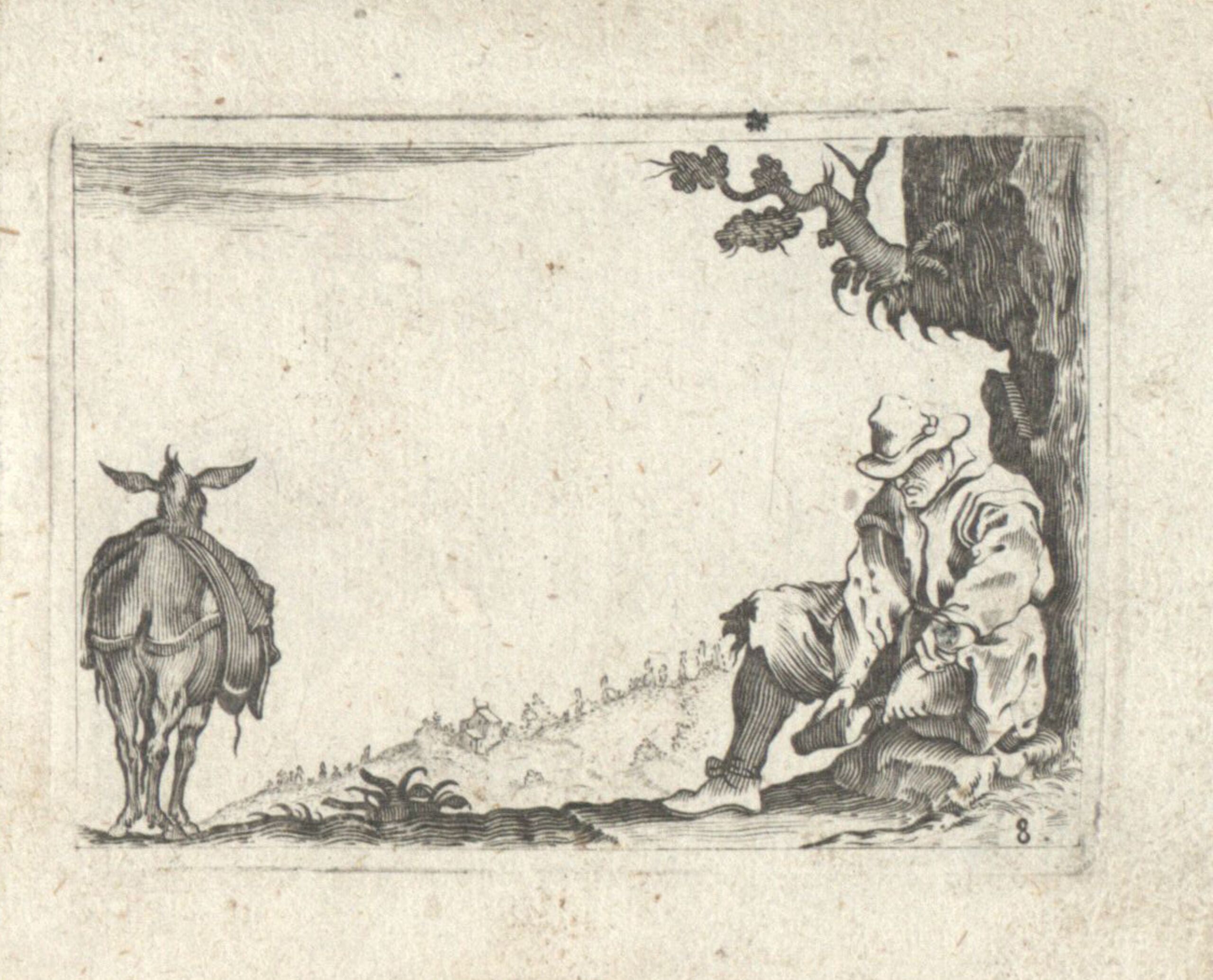 Genredarstellung, Ein rastender Mann mit einem Esel, Blatt 8 aus der Folge “Reisbuchlein für die Anfangente Jugent sich darinnen zu uibenn etc.” herausgegeben von Jacob Koppmayer, nach Jacques Callot, Jacques Callot, MAK Inv.nr. KI 2182-17