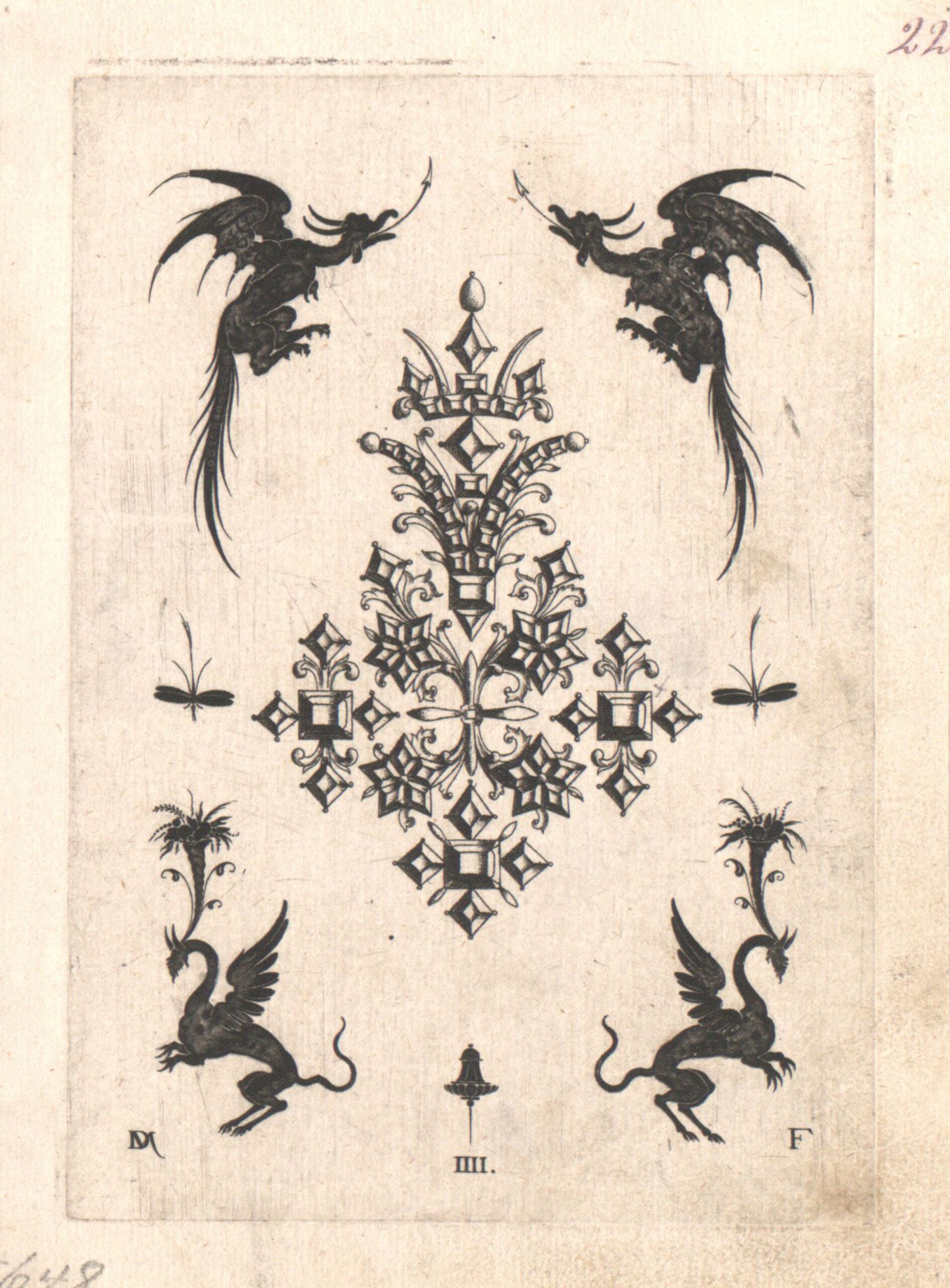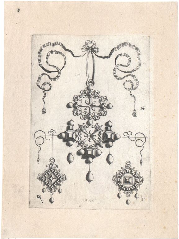 • Eine Agraffe, umgeben von silhouettierten grotesken Figuren, Blatt 4 (IIII) aus einer Folge von Goldschmiedearbeiten, auf dem Titelblatt die Aufschrift „In timore dei Daniel Mignot Invent. sculp. et excudd. hoc Augustae Vindelicorum 1596“, herausgegeben von D. Mignot (vom Bearbeiter vergebener Titel)