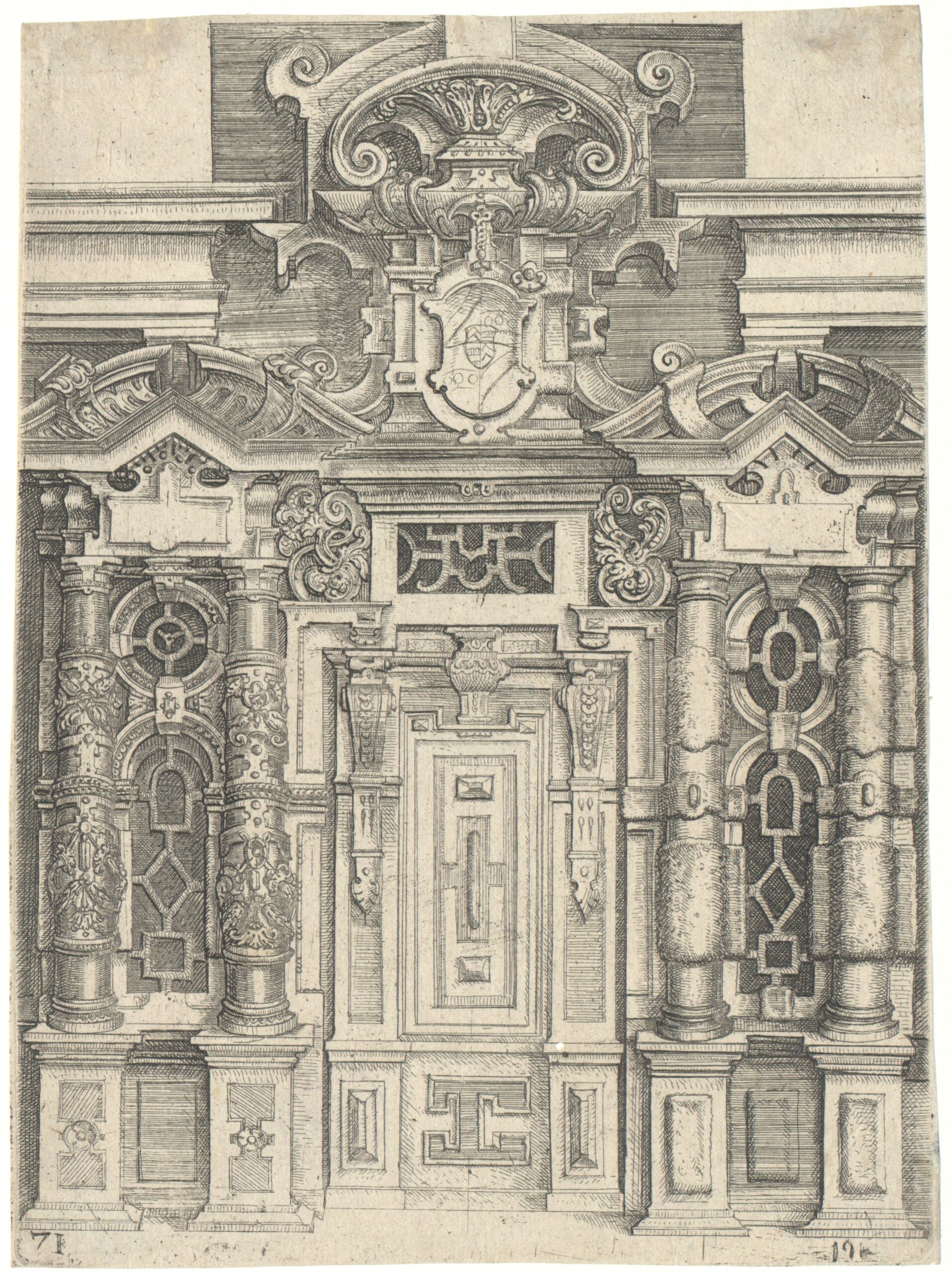 - Eine Fassade dorischer Ordnung, Blatt 71 aus der Folge „Architectur. Das Annder Buch. Von der Dorica sampt Ihrn zugegebnen Stuckhen“ (vom Bearbeiter vergebener Titel)
