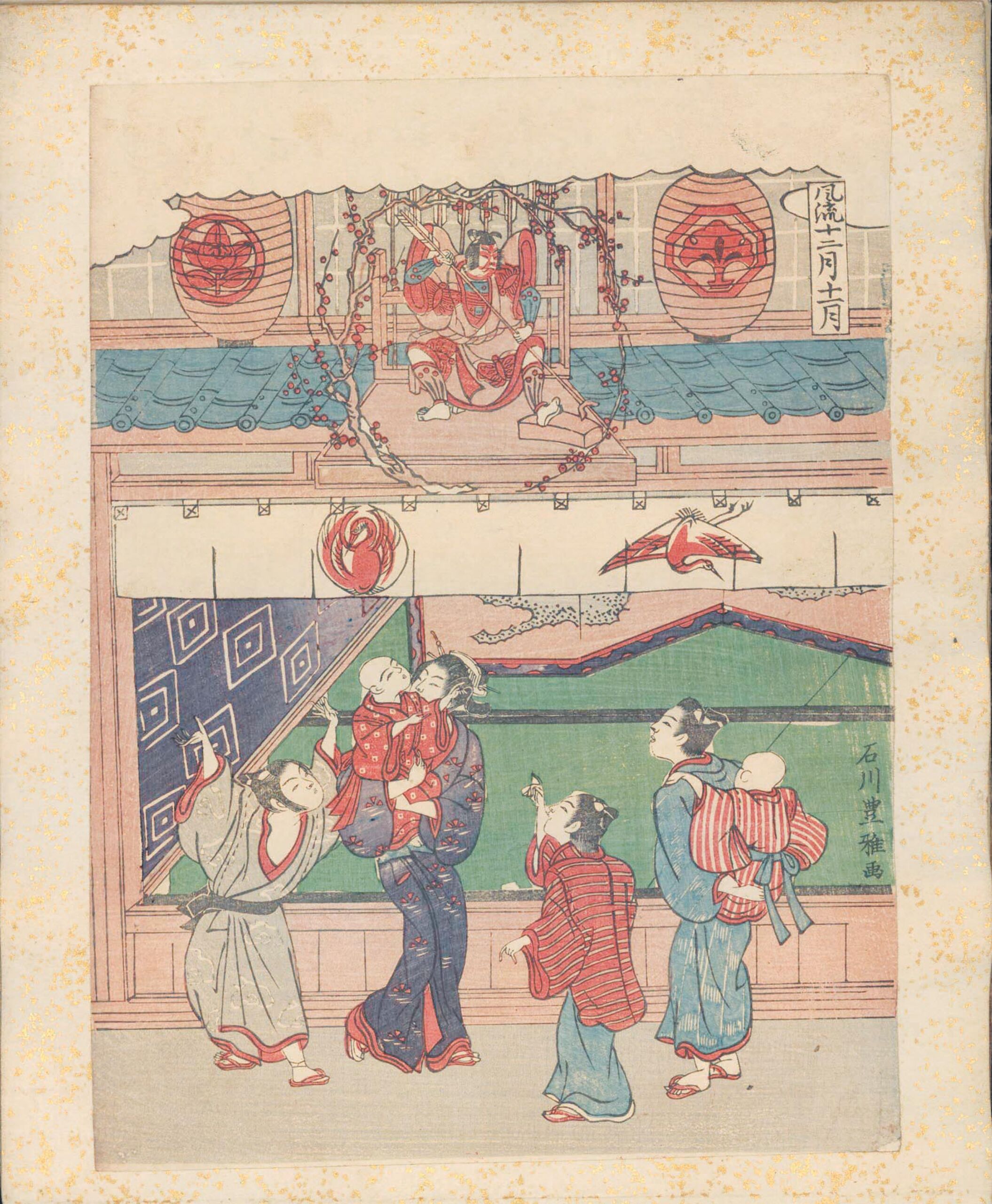 Ishikawa Toyomasaga 石川豊雅画 Zwölfteilige Serie mit typischen Festen zu jedem Monat. Hier der 11. Monat. Saisonbeginn bei Kabuki-Theater. Zur Eröffnung der Saison wurde eine Sondervorstellung gegeben, in der die Schauspieler des jeweiligen Theaters präsentiert wurden (kaomise 顔見世 = "Gesicht zeigen"). Auf dem Vordach eine Figur aus dem Stück “Yanone 矢の根", die Soga no Gorō 曾我五郎 darstellt. Davor Kinder und eine Frau mit einem Kleinkind im Arm.