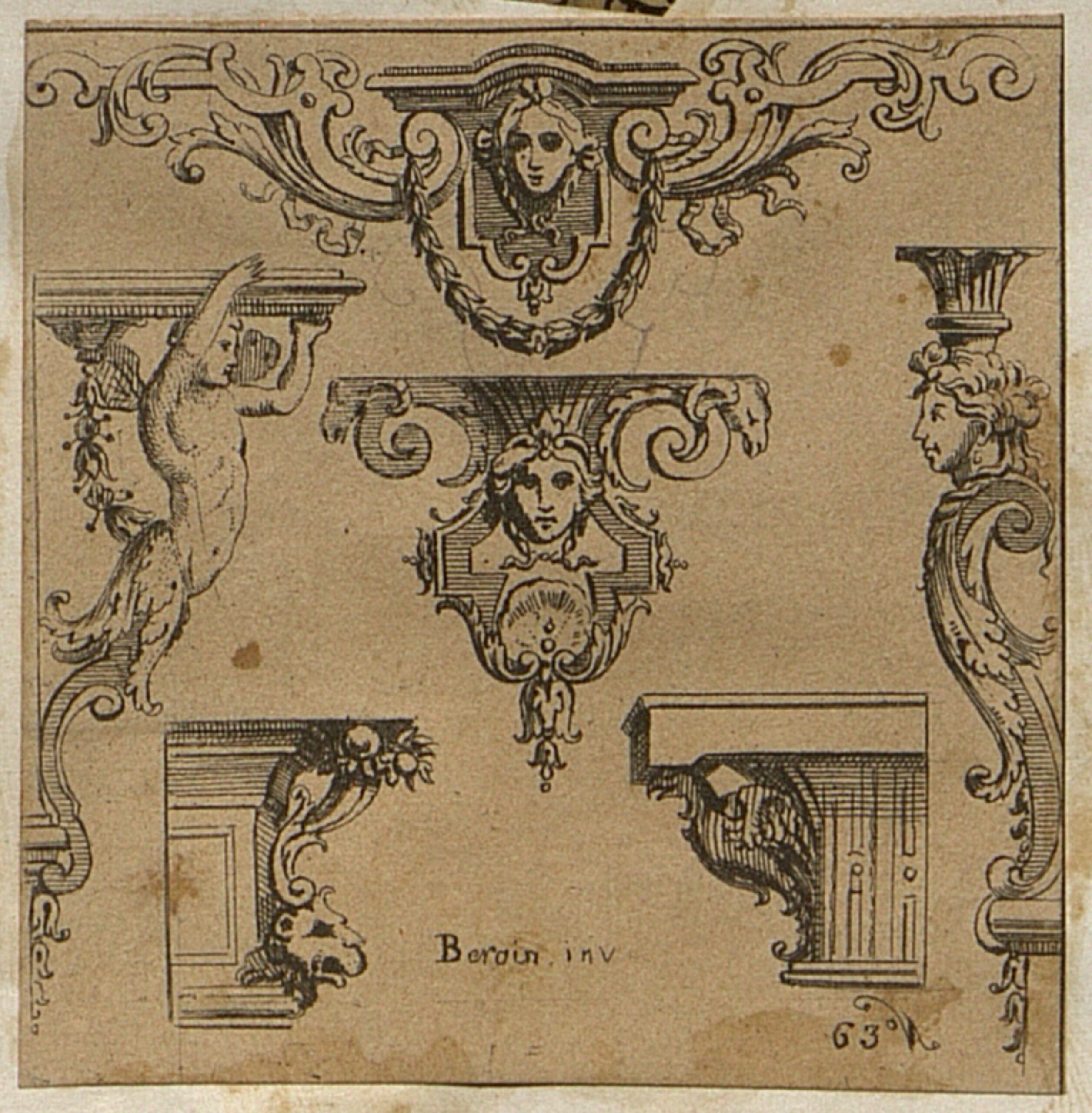 Musterblatt, Entwürfe dekorativer Elemente für Kandelaber, Beschläge und Simse mit Darstellungen von Mensch und Tier, häufig in karyatidischer Funktion, von Wilhelm Hermann Haarstrick, Wilhelm Hermann Haarstrick, MAK Inv.nr. KI 8076-1-453