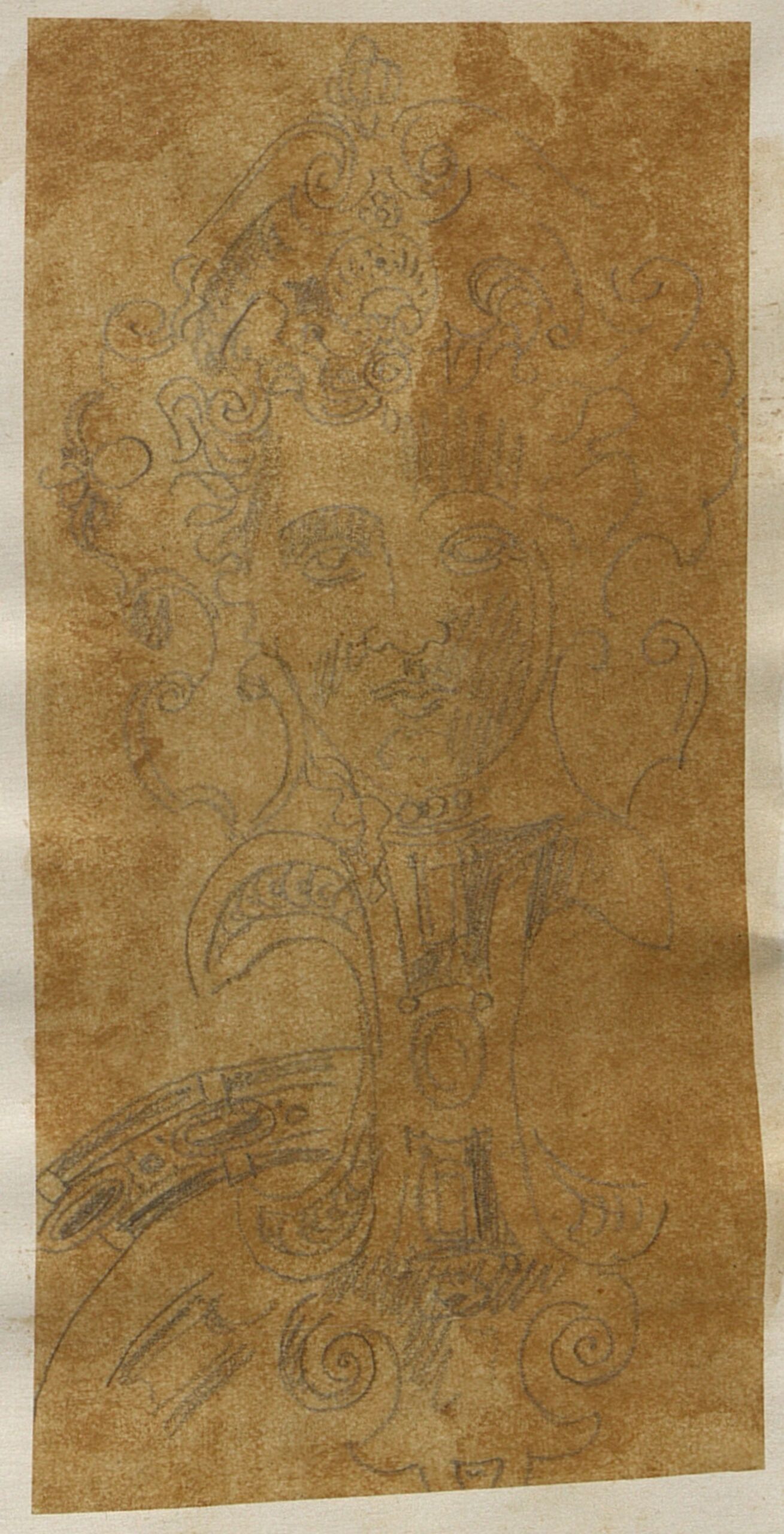 - Entwurf eines dekorativen Elements für eine Goldschmiedearbeit mit der Darstellung einer Maske von Wilhelm Hermann Haarstrick (vom Bearbeiter vergebener Titel)