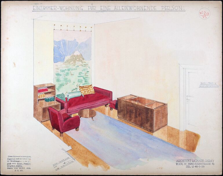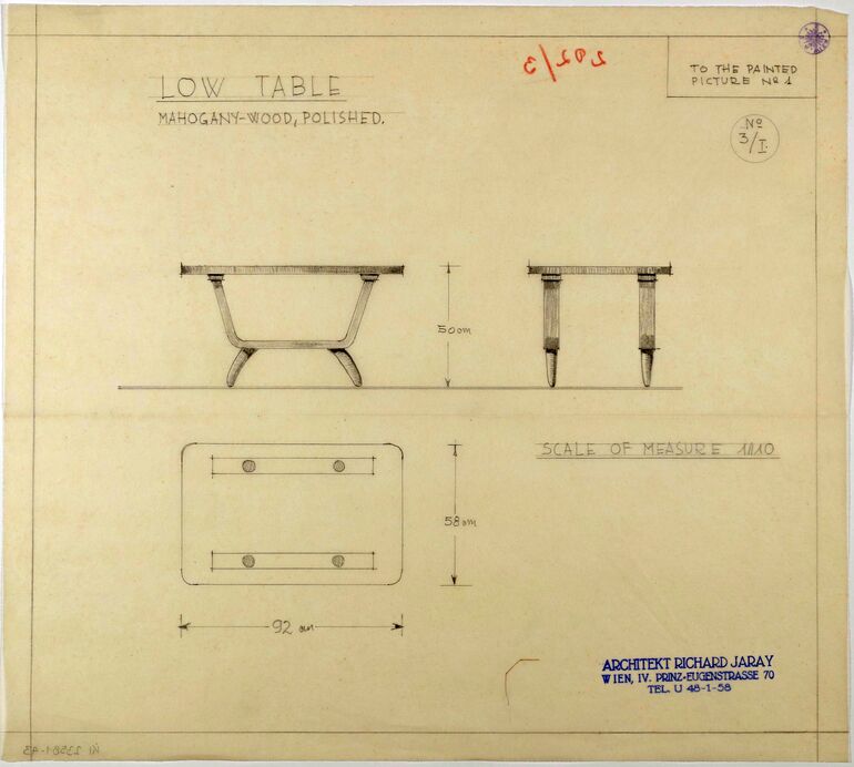 - Stempel (rechts unten) : ARCHITEKT RICHARD JARAY/ WIEN, IV. PRINZ=EUGENSTRASSE 70/ TEL. U 48-1-58