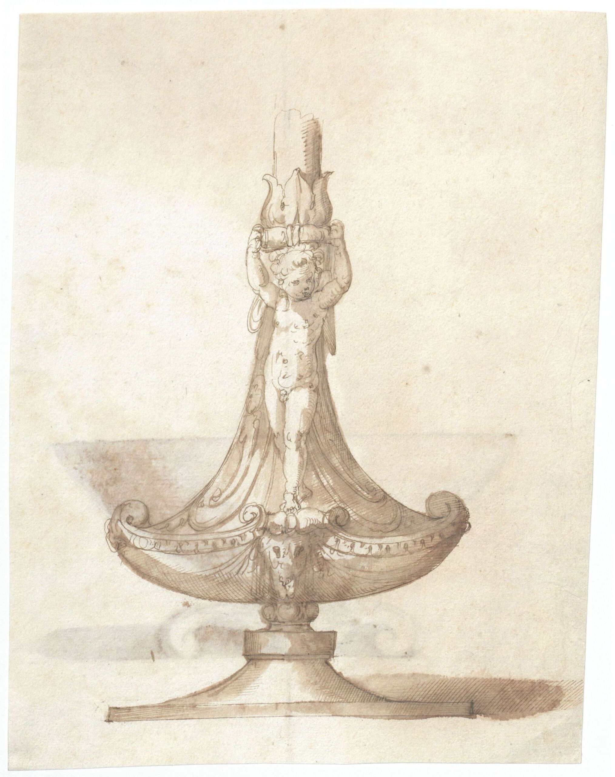 Entwurf für einen Leuchter mit geschweiftem Schaft auf einem Standfuß. Der Schaft verziert mit Putto, Schweifwerk, Maskaron und Blattwerkdekor. Verso: Entwurf für eine Schale mit geschweiftem Fuß sowie Maskaron und Blattwerkdekor.