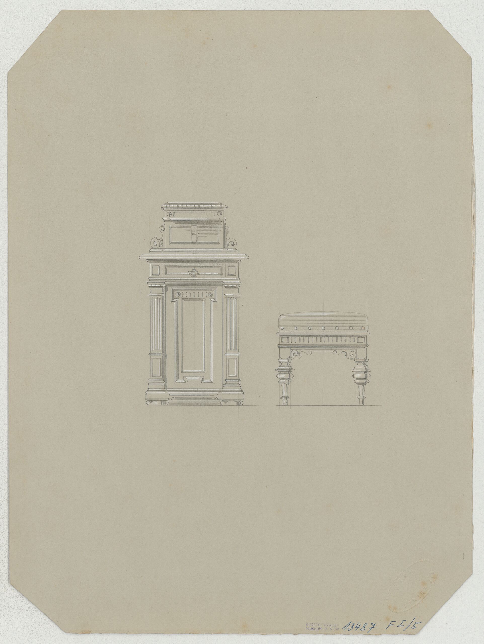 - Entwurf für einen pfeilerartigen Schrank mit Kassettenaufsatz (Vertiko?) und plastischer Architekturgliederung in Form eines Gesimses, kassettierten Feldern und Pilastern, sowie für einen gepolsterten Hocker mit Balusterbeinen, kannelierter Zarge und Volutendekor (deskriptiver Titel)