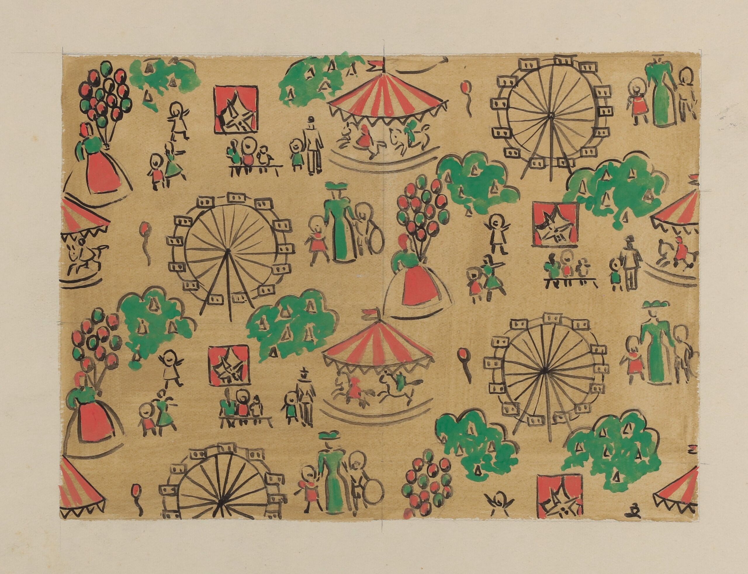 - Entwurf für Stoffdessin aus Riesenrat, Karussell und anderen Attraktionen sowie ihren Besuchern im Prater (vom Bearbeiter vergebener Titel)