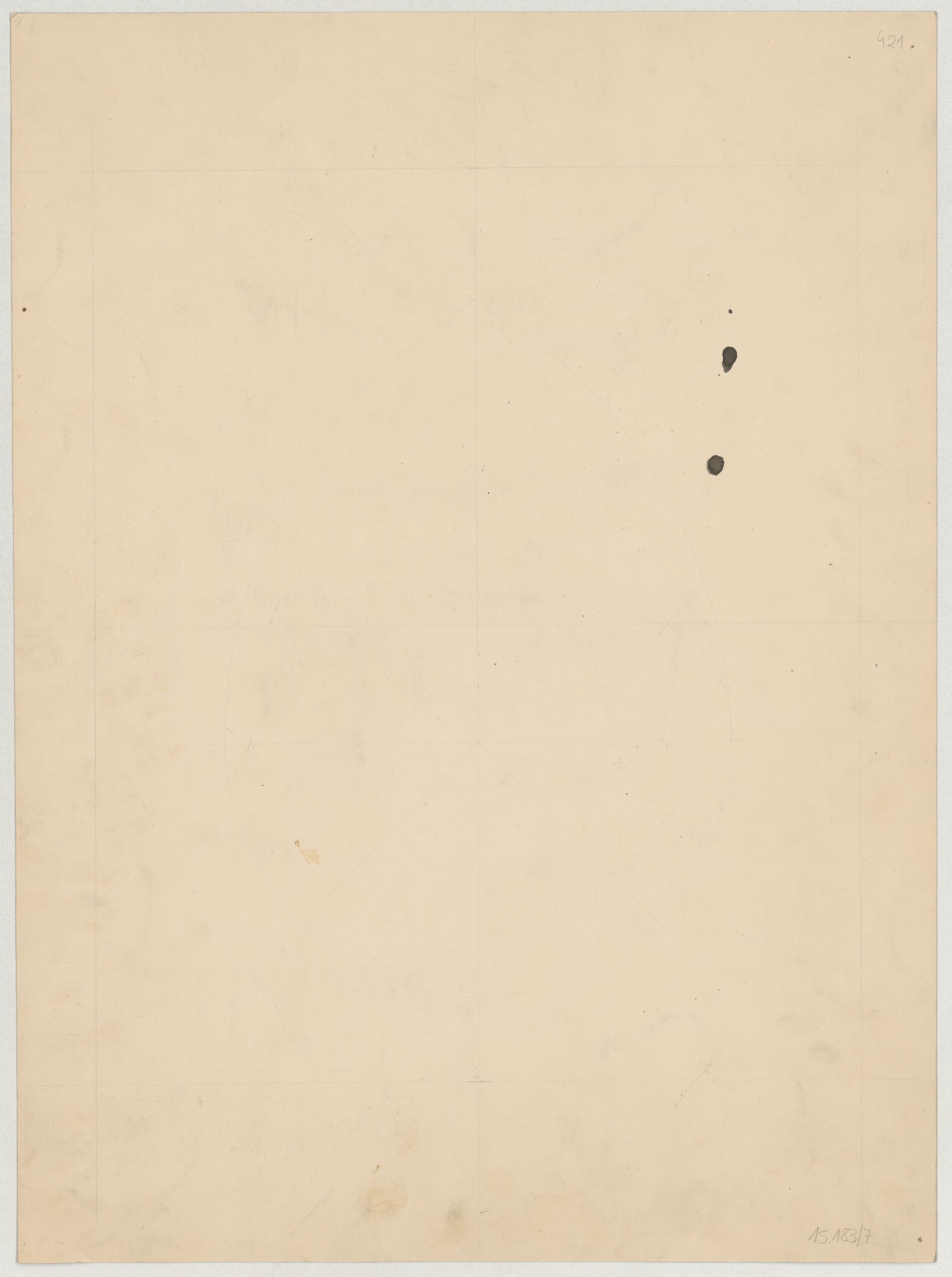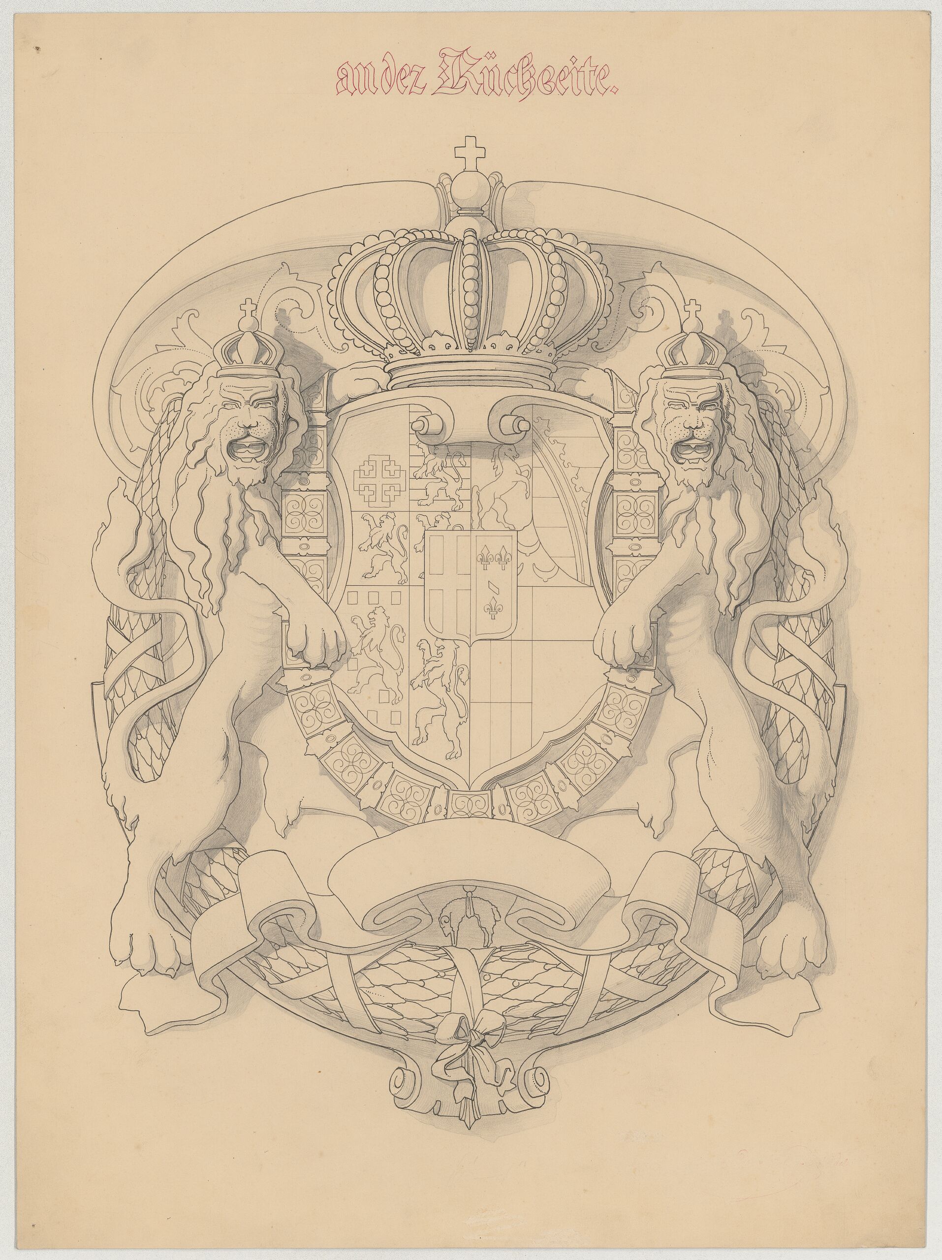 - Entwurfszeichnung für eine Wappenkartusche mit bekröntem Wappen, der Ordenskette vom goldenen Vlies und Schildhalterfiguren für das Ehrendenkmal für Prinz Eugen (vom Bearbeiter vergebener Titel)