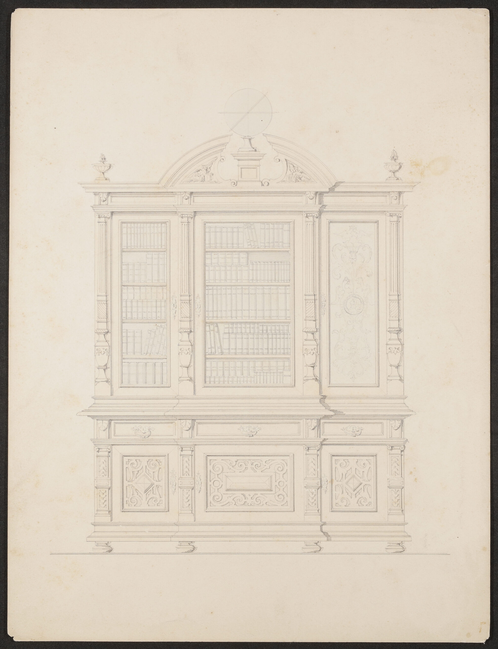 - Entwurfszeichnung für einen dreiachsigen Bücherkasten mit verglasten Türen im oberen Drittel, bekrönt von einem gesprengten Segmentgiebel mit einem Globus in der Mitte (vom Bearbeiter vergebener Titel)