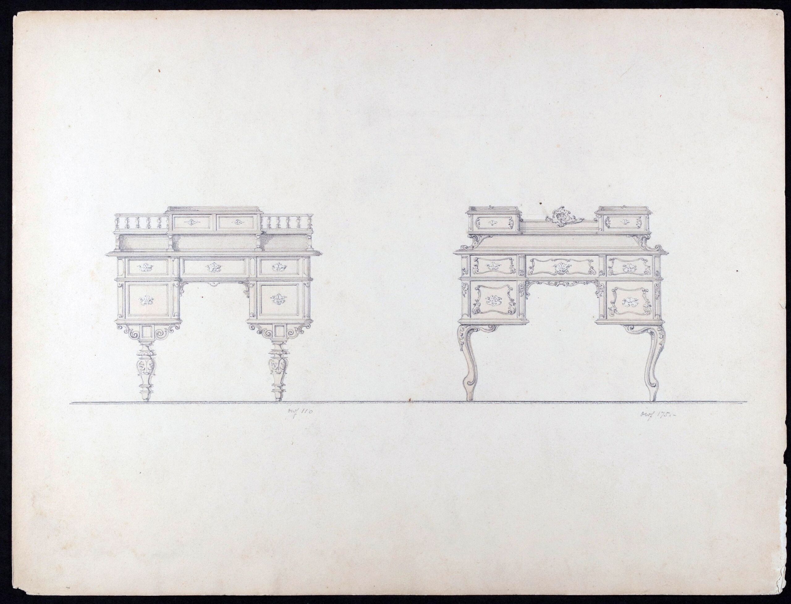 - Entwurfszeichnung für zwei Sekretäre mit je fünf Schubladen und einem Aufsatz mit weiteren zwei Schubladen und offenen Fächern (vom Bearbeiter vergebener Titel)