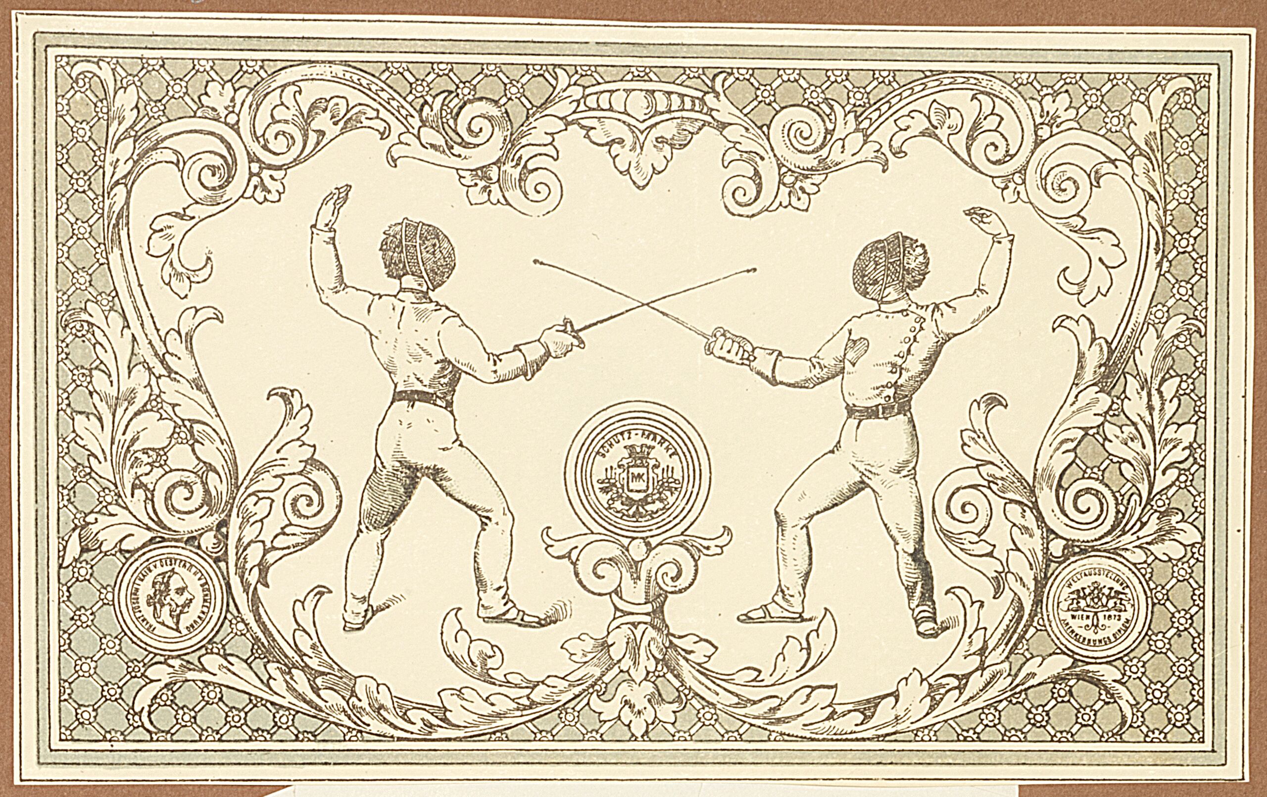 Etikett, Etikett für eine Briefpapierkassette mit einem Fechtduell als Bildmotiv, Hugo Gerard Ströhl, MAK Inv.nr. KI 7752-335