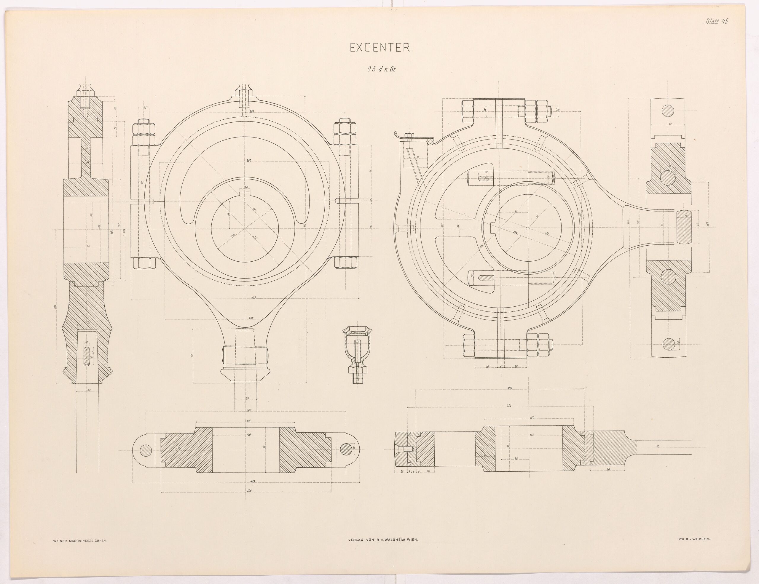 - Text am Objekt: Blatt 45; Excenter / 0.5 d. n. Gr.; Verlag von R. v. Waldheim in Wien.; WEINER, MASCHINENZEICHNEN; LITH v. R. v. WALDHEIM.