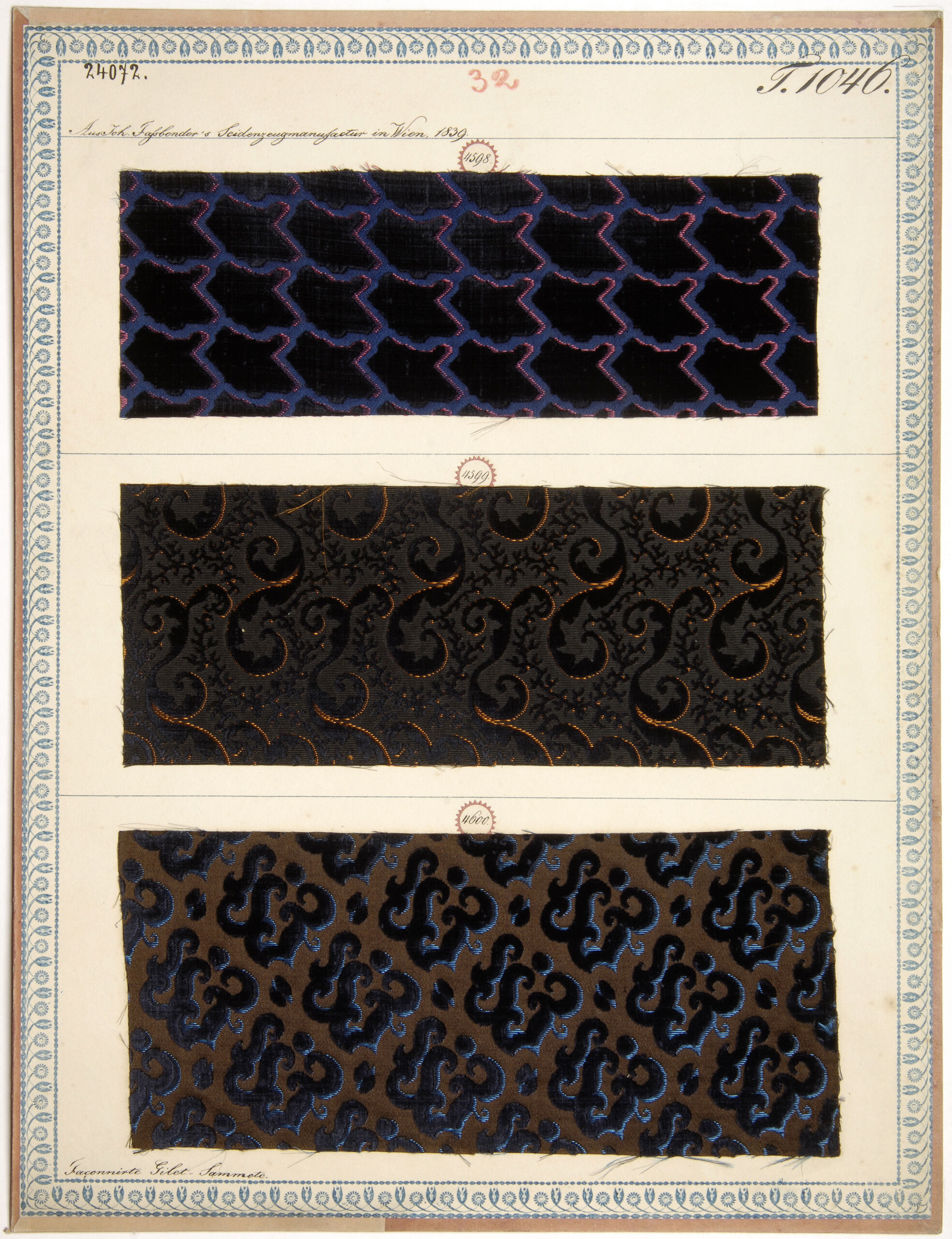 - Beschriftung (Vorderseite) : Aus Joh. Fassbender's Seidenzeugmanufactur in Wien, 1839. / Façonnirte Gilet-Sammete.