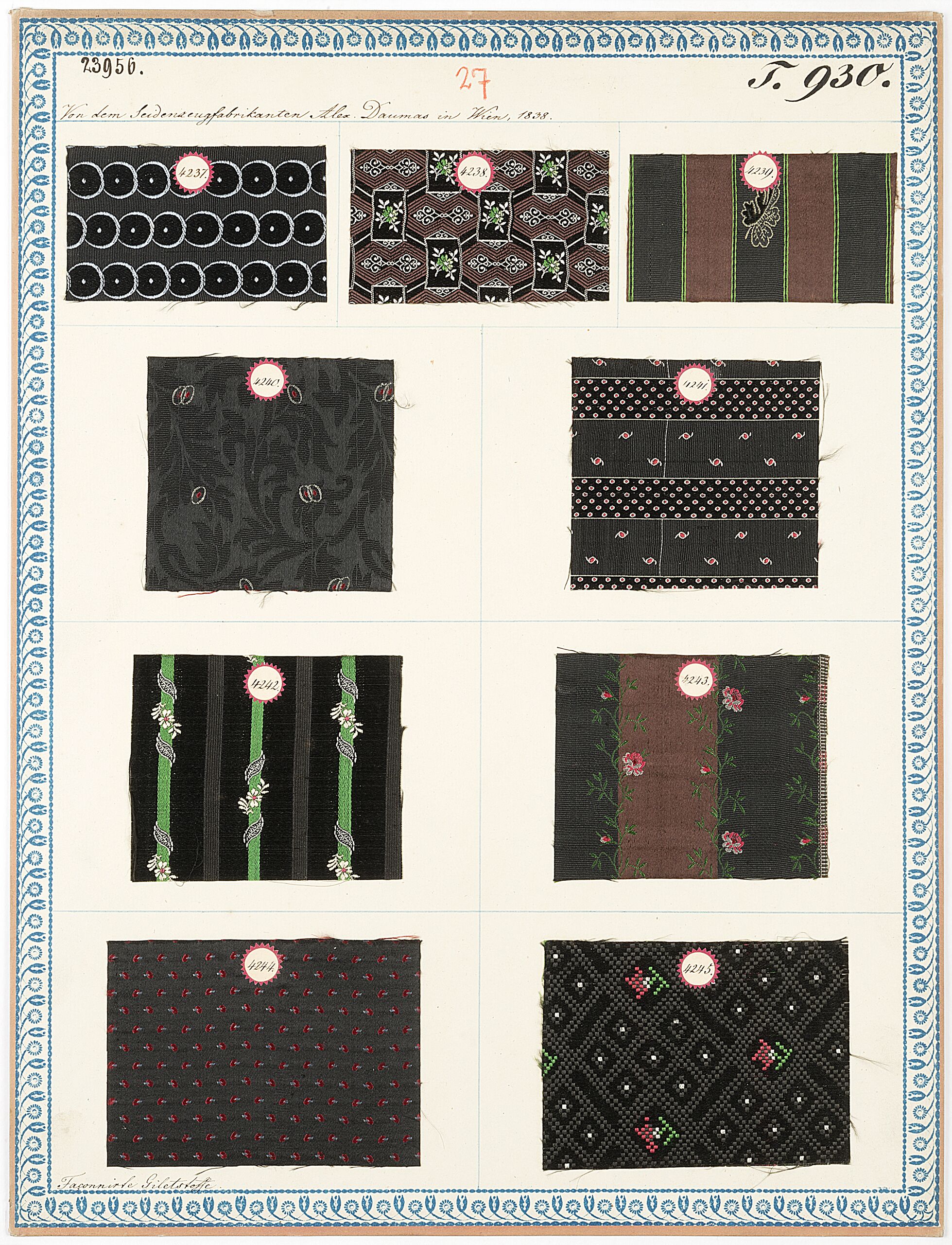 - Beschriftung (Vorderseite) : Von dem Seidenzeugfabriken Ales. Daumas in Wien, 1838. / Façonirte Giletstoffe.