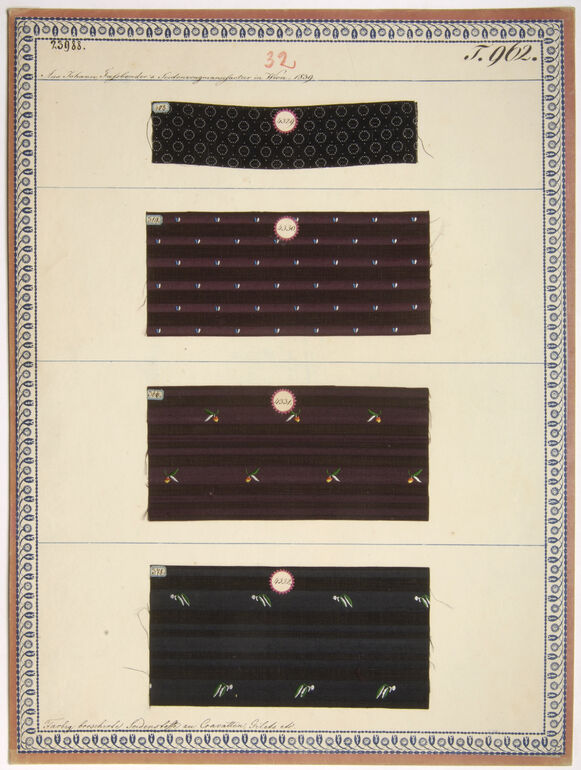- Beschriftung (Vorderseite) : Aus Jos. Fürganter's Seidenzeugmanufactur in Wien, 1838. / Façonnirte schwere Mandarin-Stoffe.