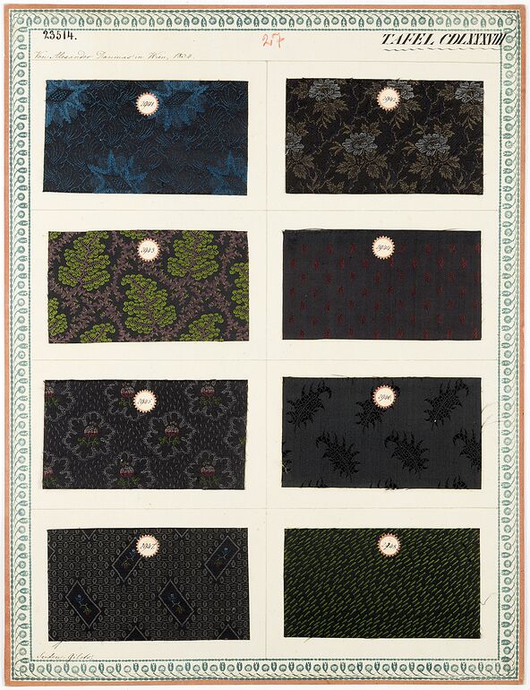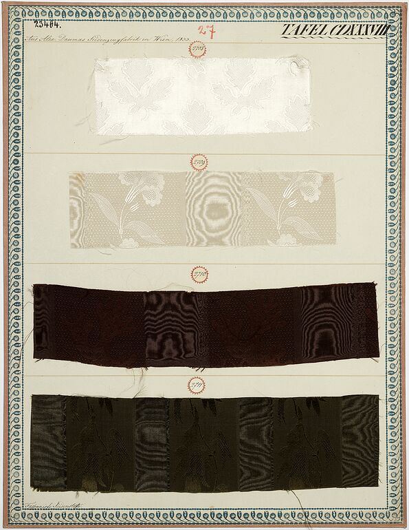 - Beschriftung (Vorderseite) : Aus Alex. Daumas Seidenzeugfabrik in Wien, 1831. / Façonnirter Atlas. / Gemusterte Seidenstoffe.