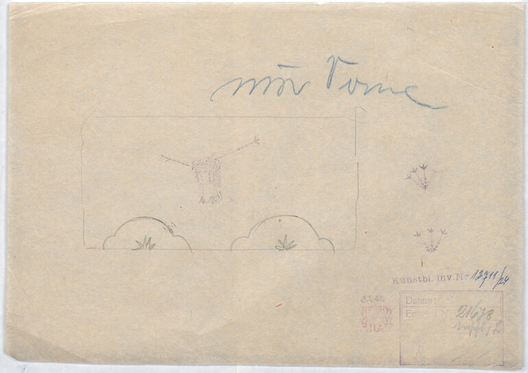Fächerentwurf mit Ansicht des Kolosseums und einiger Tempel, einer als Tempio di Giove Tonante des Forum Romanums identifiziert, ein anderer als "T. di Guirino" (?) bezeichnet. Die Ansichten werden von ornamentalen Feldern und Grottesken flankiert. Auf dem Verso befinden sich im gerahmten Feld des Fächerblattes ein grotteskes Ornament sowie zwei Schmetterlinge.