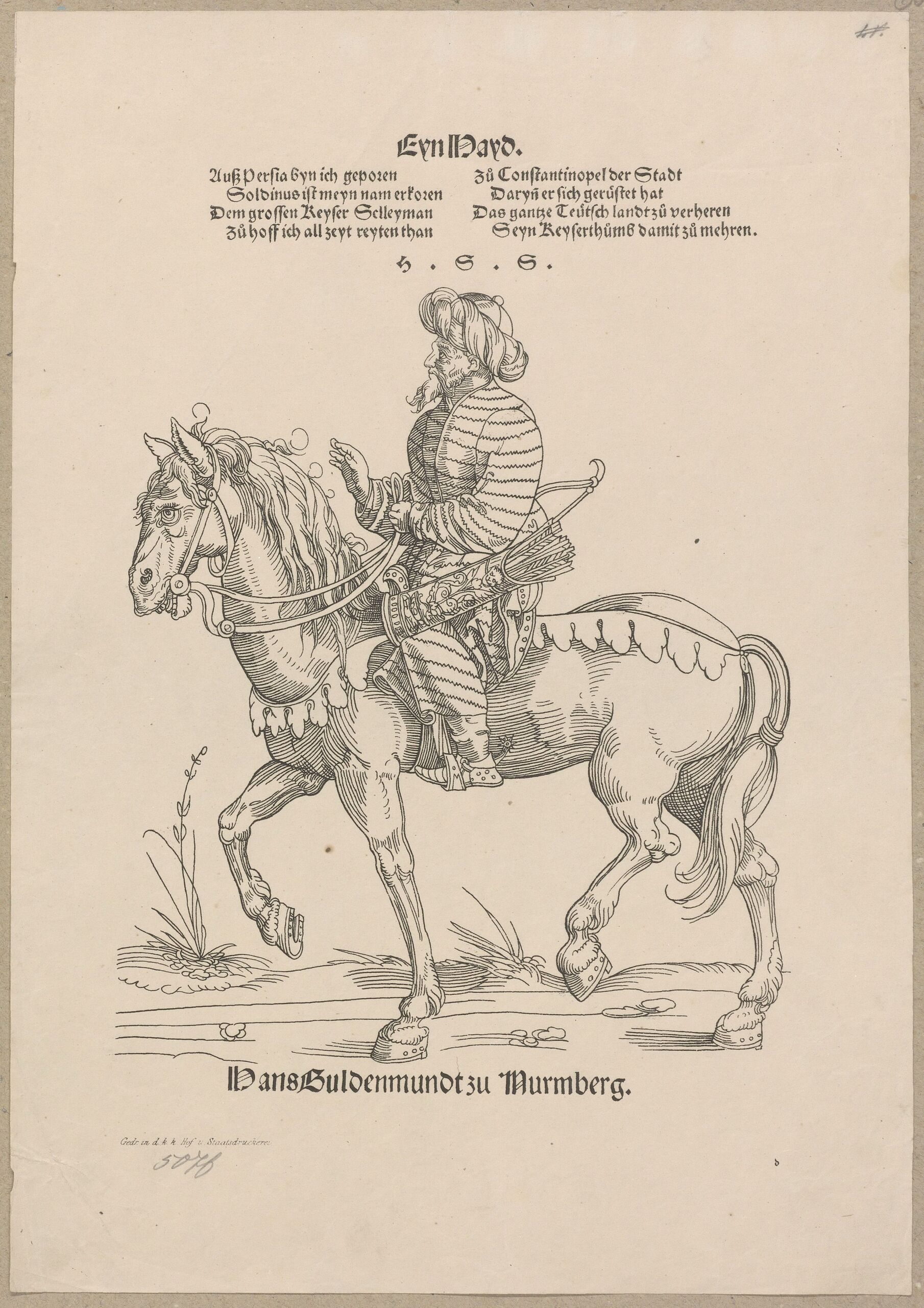 - Text am Objekt: Eyn Hayd. / Aus Persia byn ich gepozen / Goldinus ist meyn nam erkozen / Dem grossen Keyser Sclleyman / zu hoff ich all zeyt reyten than / Zu Constantinopel der Stadt / Daryn er sich gerustet hat / Das gantze landt zu verheren / Seyn Keyserthumb damit zu mehren. / H ∙ S ∙ S ∙ / Hans Guldenmundt zu Nurmberg. / d; Gedr. in d. k. k. Hof- u. Staatsdruckerei. [gedruckter Text]
