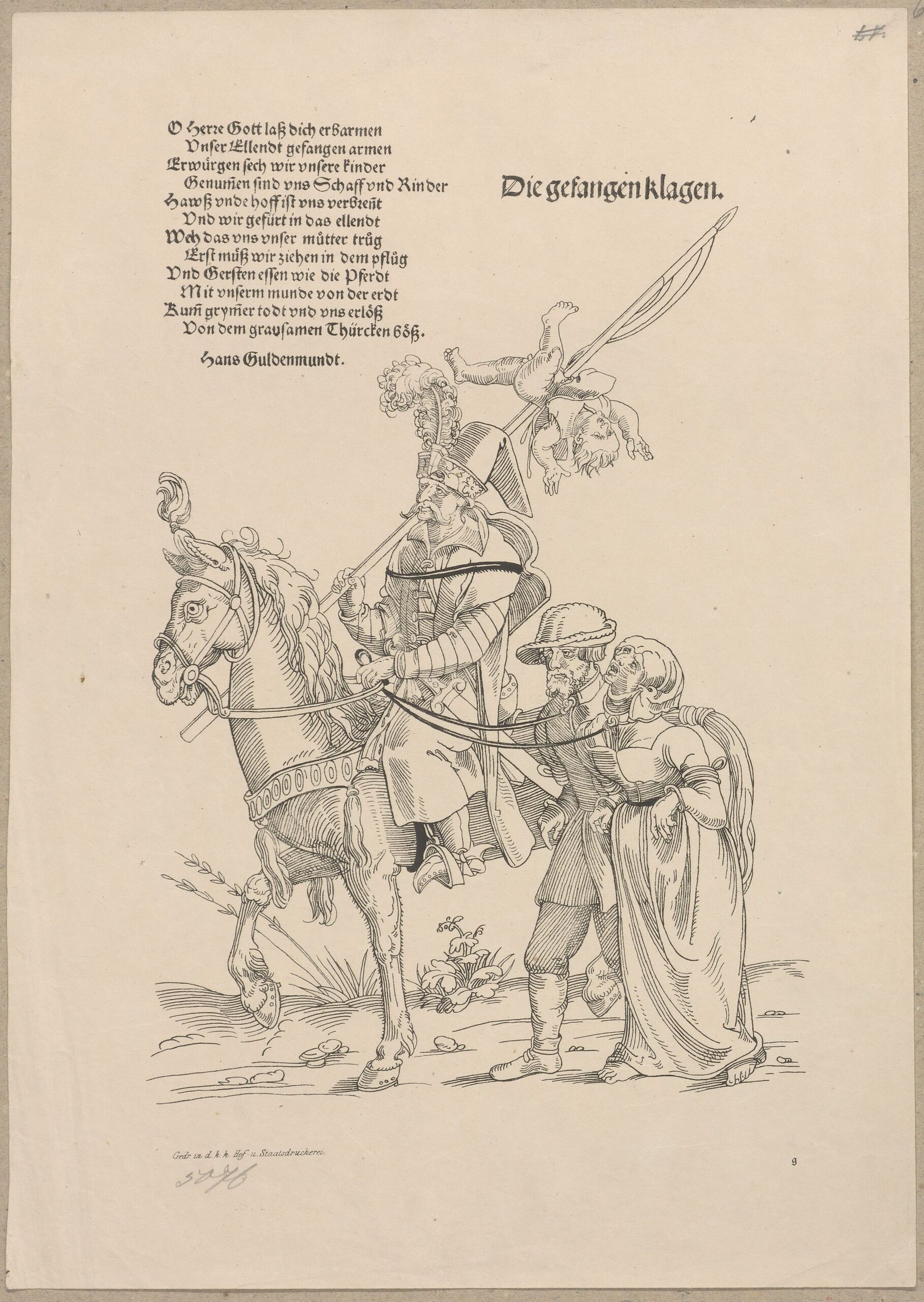 - Text am Objekt: Die gefangen klagen.; O Herre Gott laß dich erbarmen / Unser Ellendt gefangen armen / Erwürgen sech wir unsere kinder / Genumen sind uns Schaff und Rinder / Haus unde hoff ist uns verbrent / Und wir gefürt in das ellendt / Weh das uns unser mutter trug / Erst muß wir ziehen in dem pflug / Und Gersten essen wie die Pferdt / Mit unserm munde von der erdt / Kum grymer todt und erlöß / Von dem grausamen Thürcken bloß. / Hans Guldenmundt. / g; Gedr. in d. k. k. Hof- u. Staatsdruckerei. [gedruckter Text]