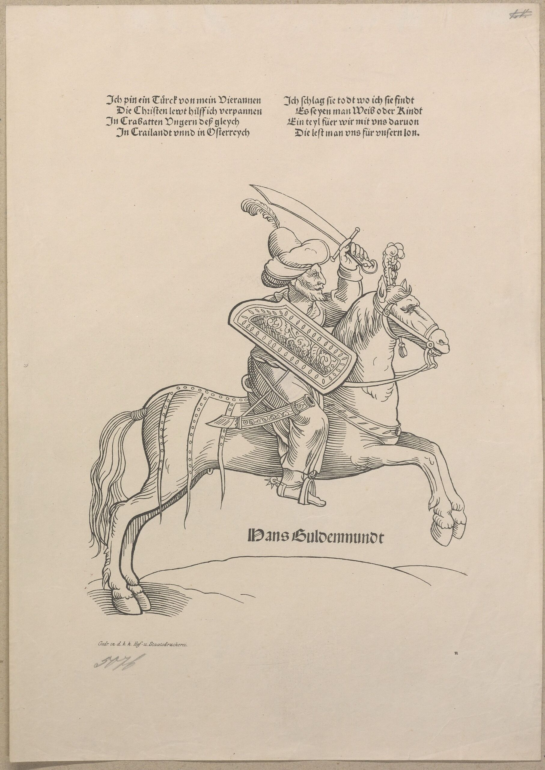 - Text am Objekt: Ich pin ein Turck von mein Vierannen / Die Christen leut hilff ich verpannen / In Crabatten Vngern deß gleych / In Crailand unnd in Osterreych; Ich schlag sie todt wo ich sie findt / Es seyen man Weiß oder Kindt / ein teyl füer wir mit uns darvon / Die lest man uns für unsern lon. / Hans Guldenmundt / n; Gedr. in d. k. k. Hof- u. Staatsdruckerei. [gedruckter Text]