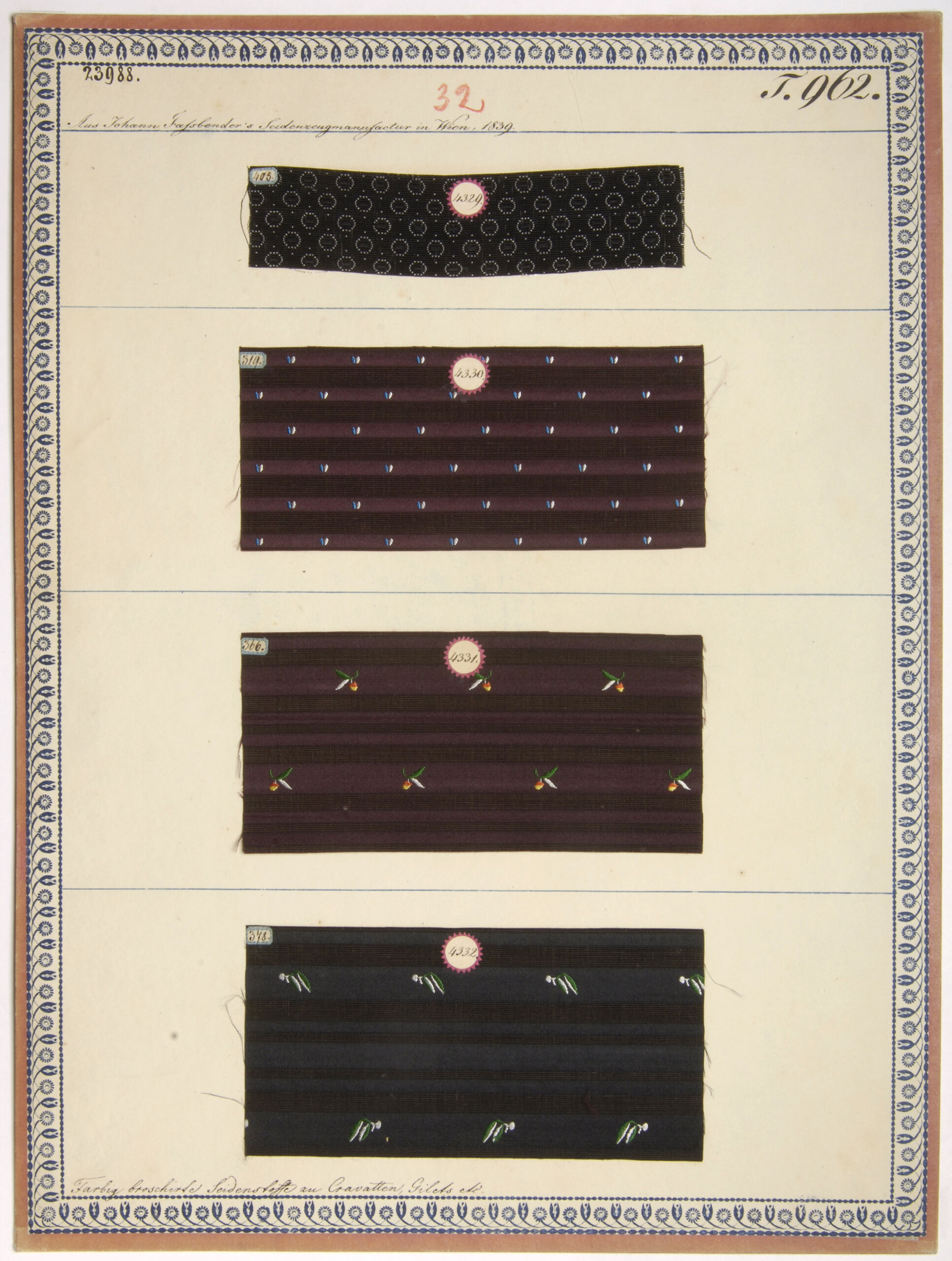 - Beschriftung (Vorderseite) : Aus Johann Fassbender's Seidenzeugmanufactur in Wien, 1839. / Farbig broschirte Seidenstoffe zu Cravatten, Gilets etc.
